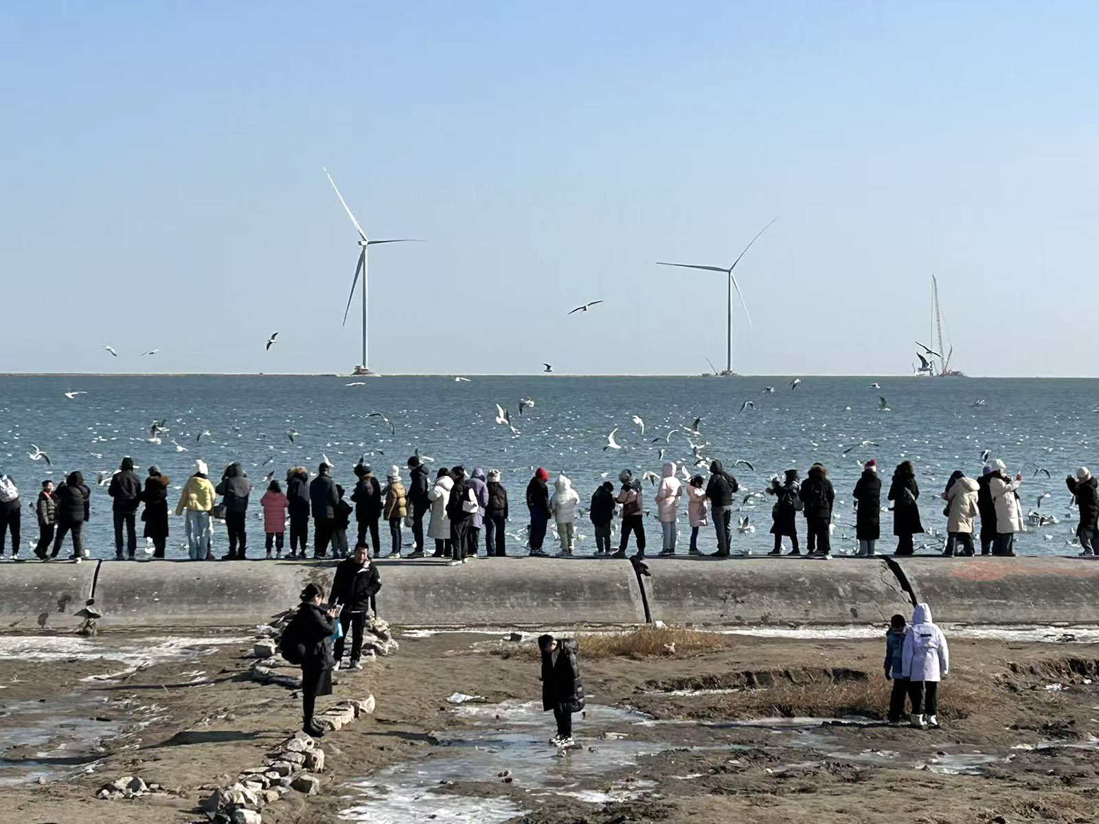 People watch gulls from an embankment in front of offshore windmills in Binhai New Area of Tianjin. (JIA JIYE / FOR CHINA DAILY)
