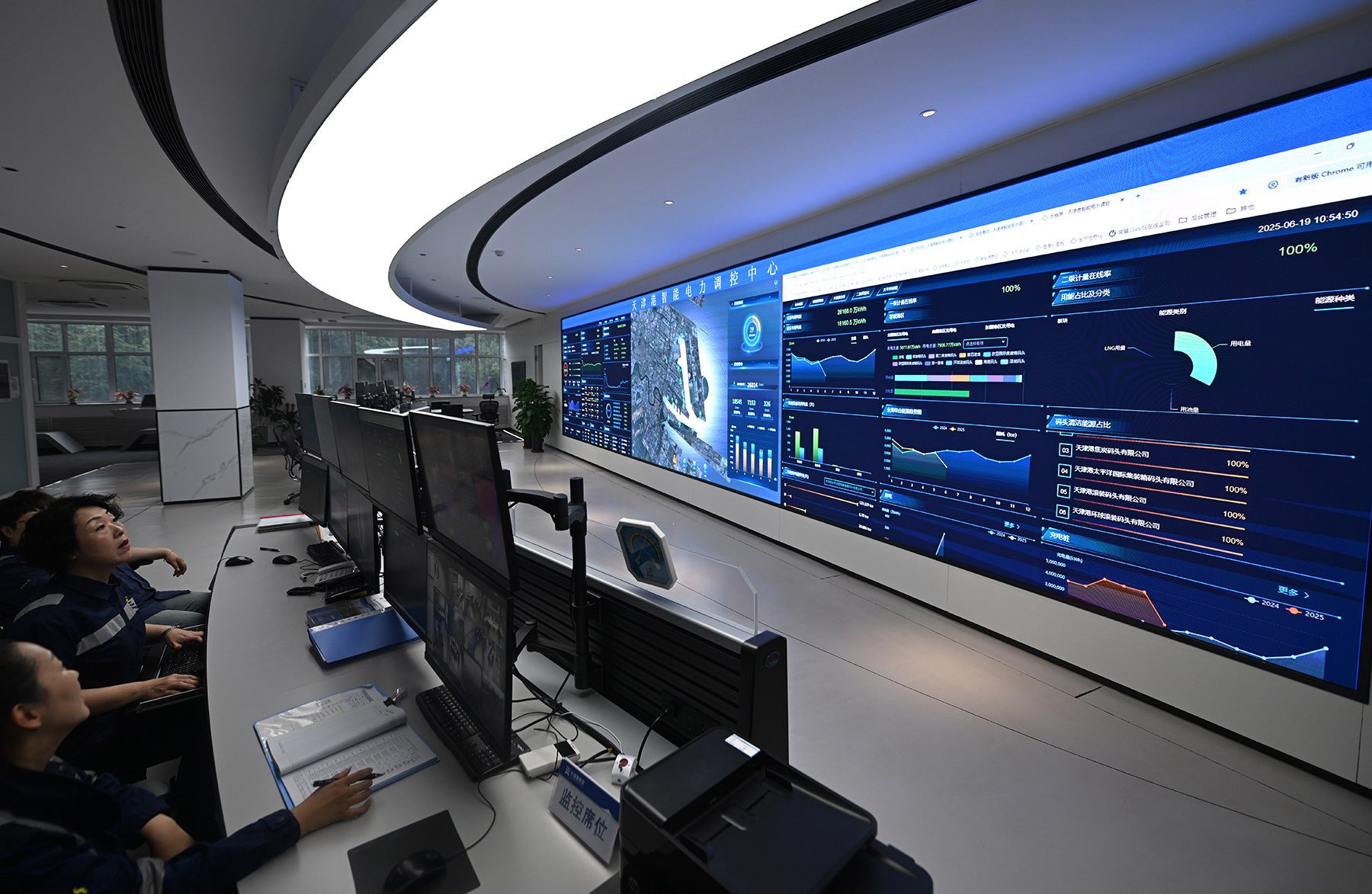 Workers monitor a smart electricity management system for Tianjin Port on June 19, 2025. (PHOTO / XINHUA)