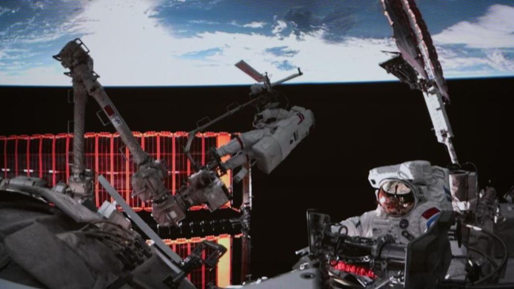 This screen image captured at Beijing Aerospace Control Center on Dec 9, 2025 shows Shenzhou XXI astronaut Zhang Lu performing extravehicular activities outside China's orbiting space station. (PHOTO / XINHUA)