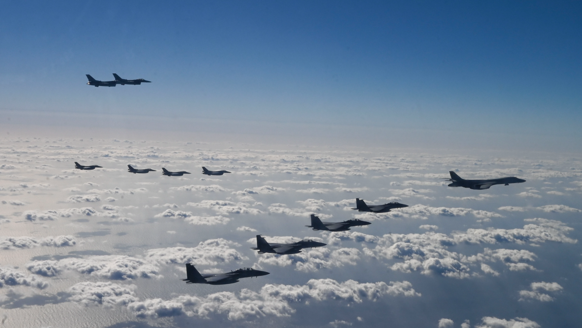 In this photo provided by the US Air Force via the Republic of Korea’s Defense Ministry, US Air Force B-1B bombers, F-16 fighter jets, the ROK’s Air Force F-15K fighter jets and Japanese Air Force F-2 fighter jets fly during a trilateral air drill at an undisclosed location, Nov 3, 2024. (PHOTO / US AIR FORCE/ROK DEFENSE MINISTRY VIA AP)