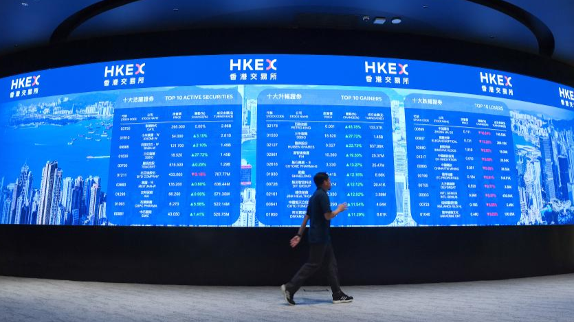 In this file photo dated May 20, 2025, a man walks past an electronic display board at the Hong Kong Stock Exchange in Hong Kong. (PHOTO / XINHUA)