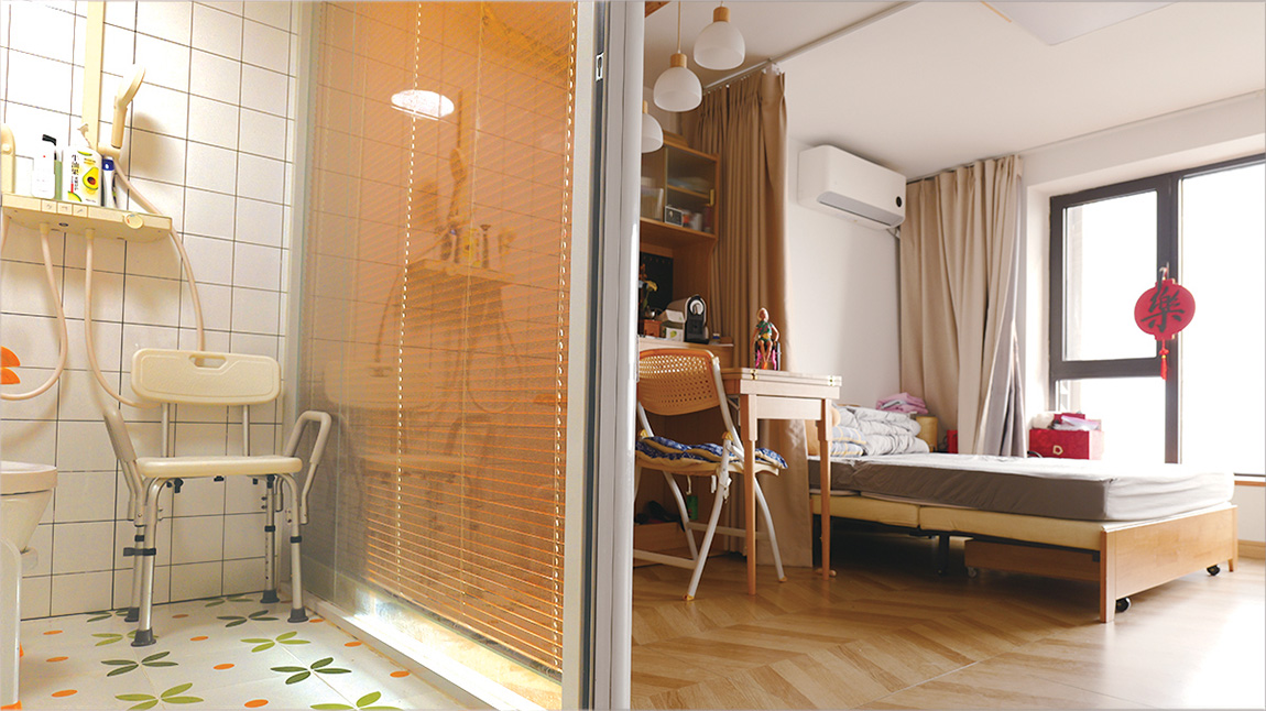 At Yameng's Home, every detail has been thoughtfully designed. At the entrance, a 3-centimeter-high ramp allows easy access for wheelchair users. In the kitchen, the counters are lowered to make cooking more convenient for guests with limited mobility. The bathroom mirror is mounted on a pivot so it can be adjusted for both seated and standing users. In the bedroom, the bed height can be altered by adding or removing mattresses to suit different needs.