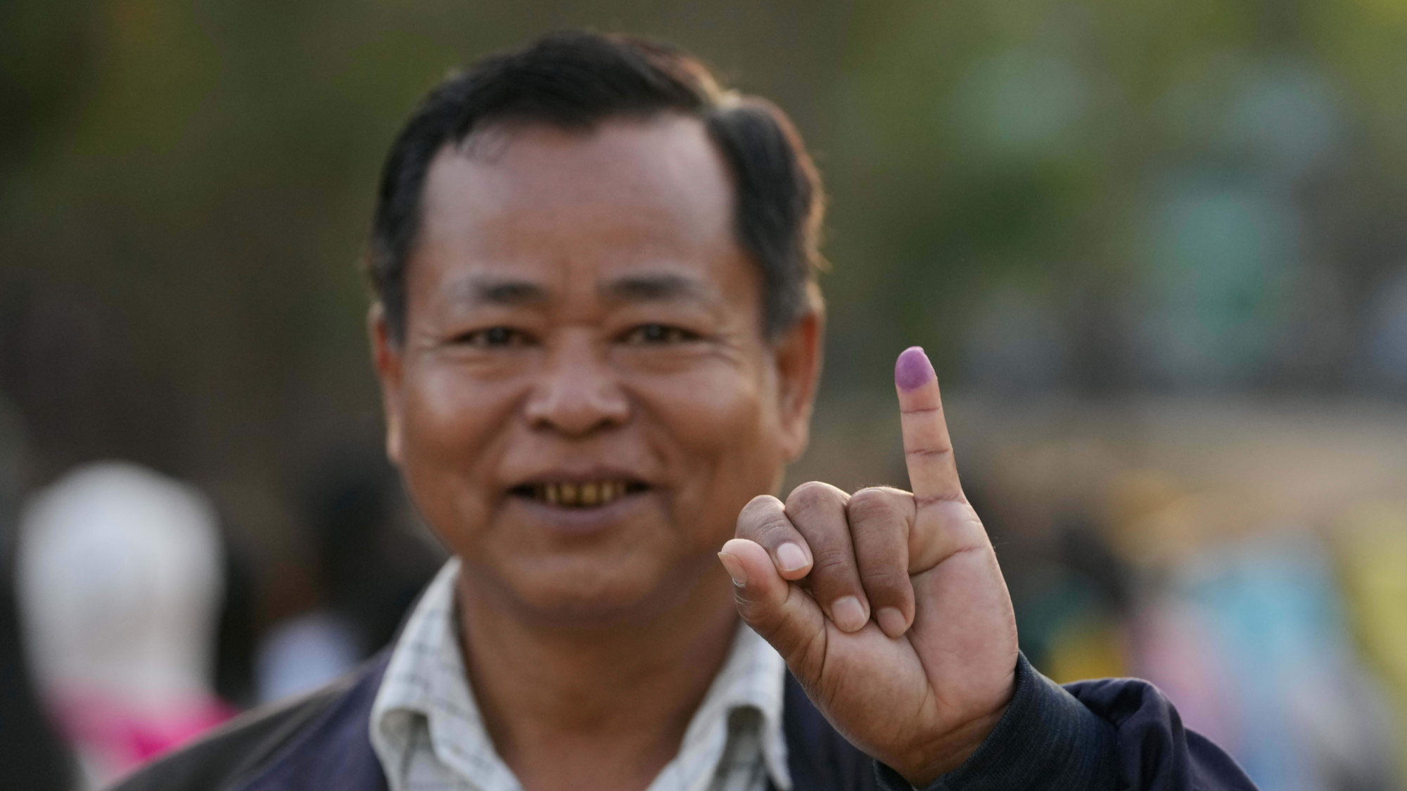 A voter holds up his finger, marked with ink to indicate he voted, at a polling station in Naypyitaw, Myanmar, Dec 28, 2025. (PHOTO / AP)