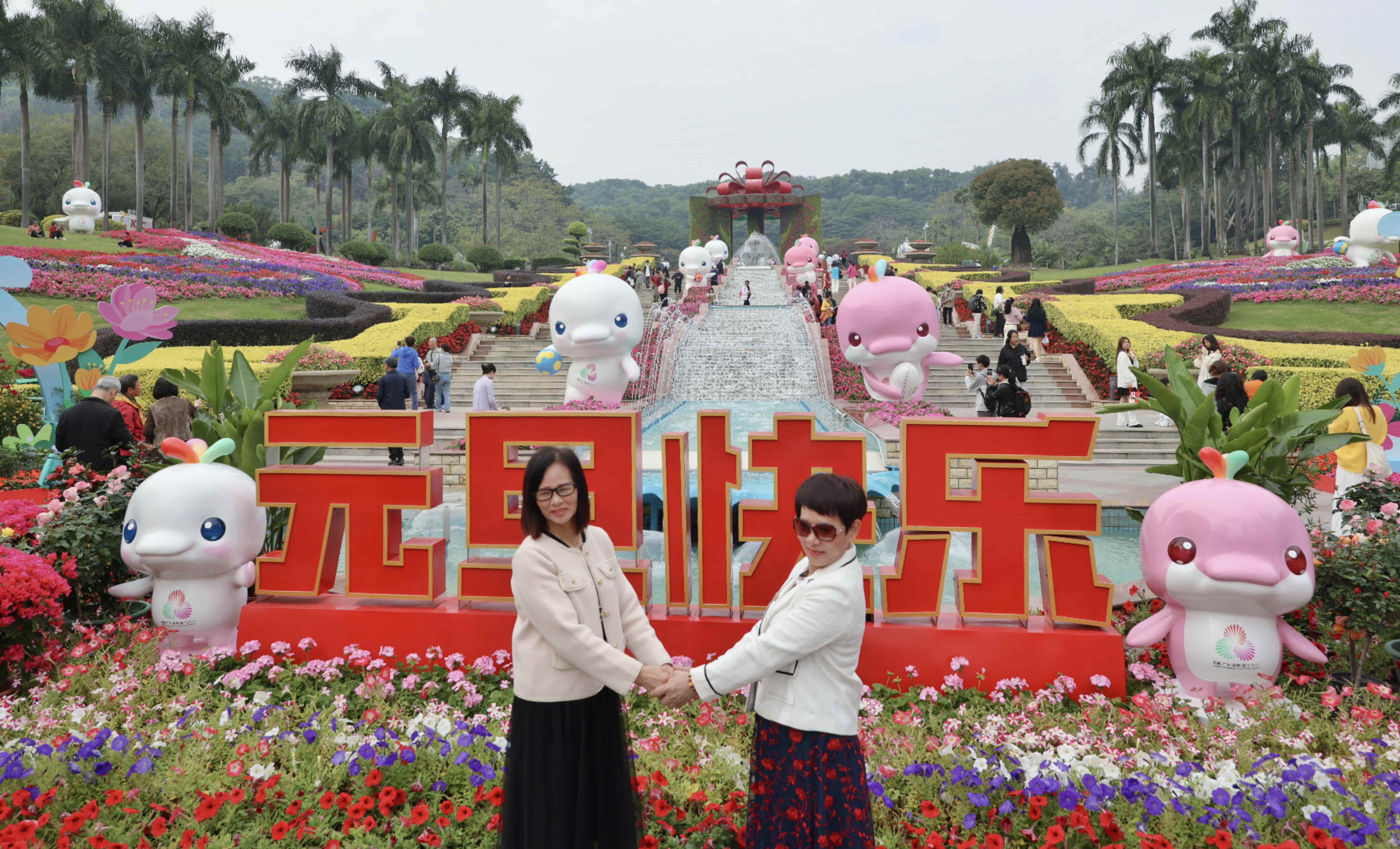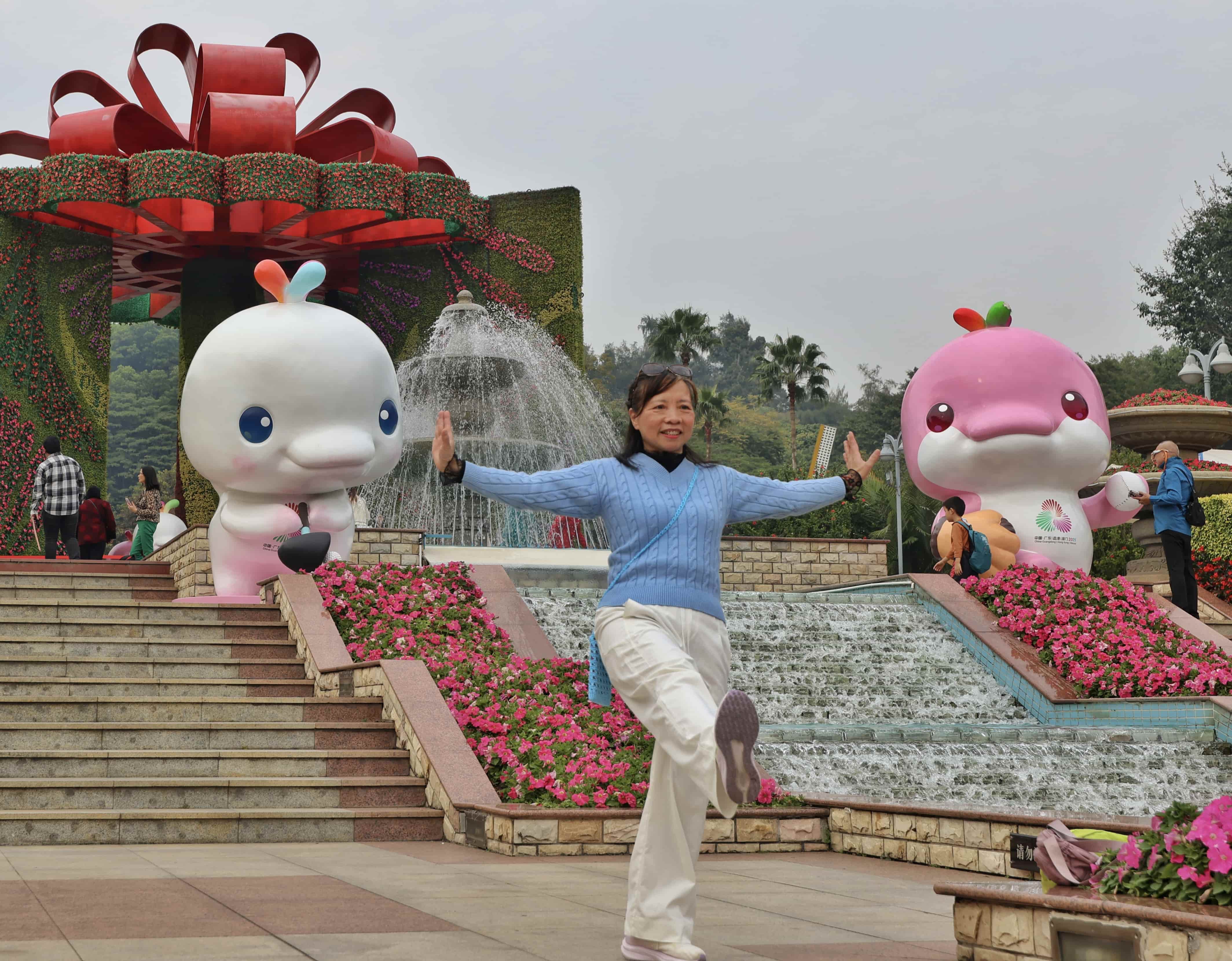 Tourists take photos with "Dawan Chicken" Xi Yangyang, a mascot of the 15th National Games, in Guangzhou's Yuntai Garden, which has been transformed into the "Dawan Chicken Theme Park", Dec 31, 2025. (PARKER ZHENG / CHINA DAILY)