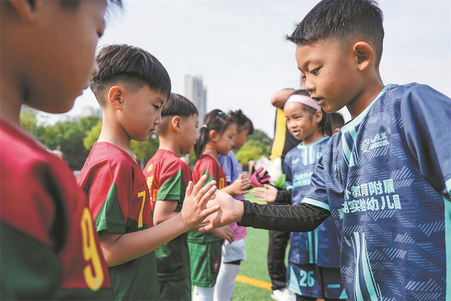 Young players greet each other before the start of a match in the kindergarten. (PHOTO BY SHENG JIACHUN / FOR CHINA DAILY)