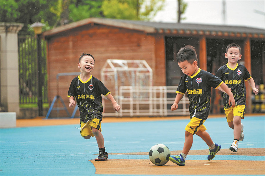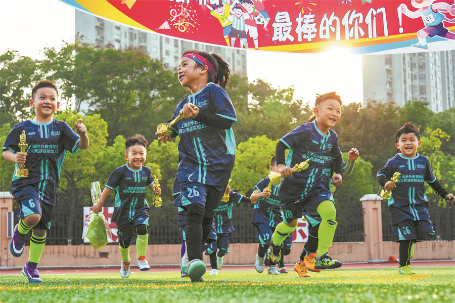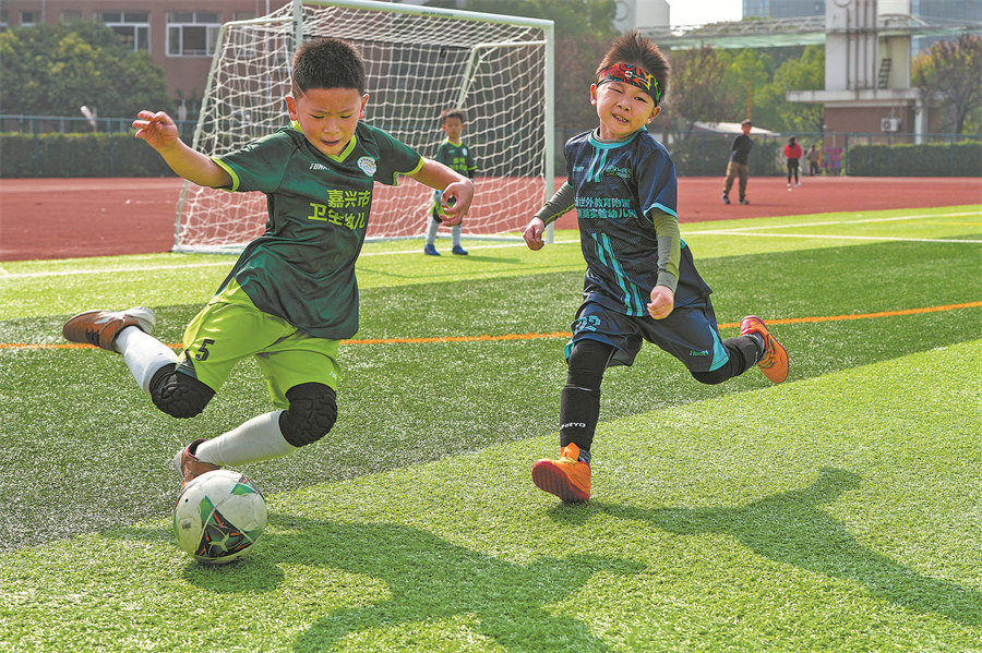 Young players chase the ball in the field. (PHOTO BY SHENG JIACHUN / FOR CHINA DAILY)