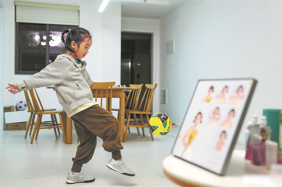 Chen Muyou, who is the only female player in her team, practices her football skills at home. (PHOTO BY SHENG JIACHUN / FOR CHINA DAILY)