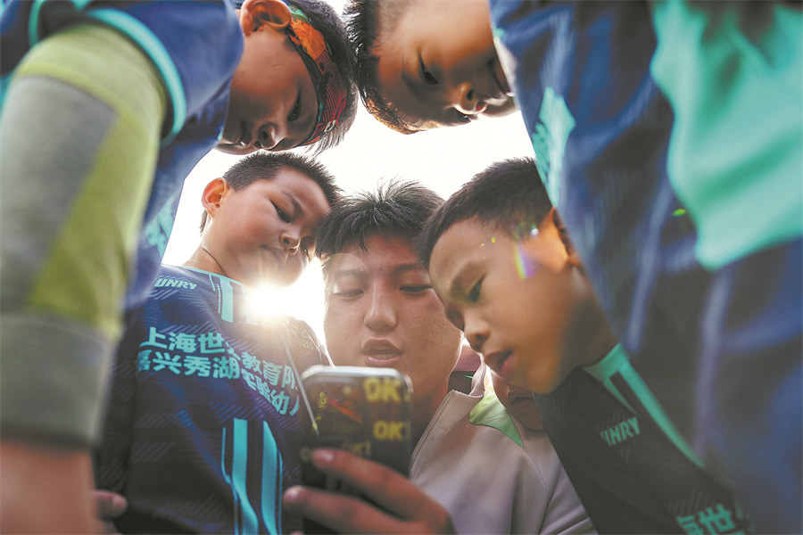 Young players implement new strategies their coach taught them on the field during training. (PHOTO BY SHENG JIACHUN / FOR CHINA DAILY)