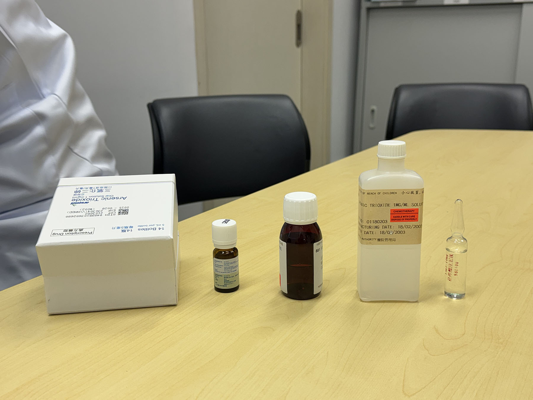 Samples of arsenic trioxide are displayed at the University of Hong Kong’s department of medicine on Nov 24, 2025, with the intravenous version (front row, left) from the Chinese mainland and the fourth-generation locally developed oral treatment beside it. (SHADOW LI / CHINA DAILY)