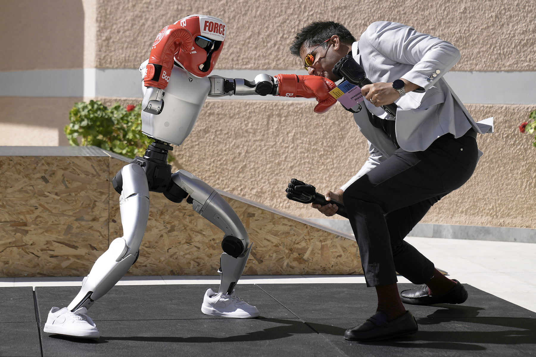A Unitree G1 robot spars with Aadeel Akhtar, CEO and founder of Psyonic, at the first International Humanoid Olympiad at the Olympic Academy in Olympia, Greece, on Sept 1, 2025. (PHOTO / AP)