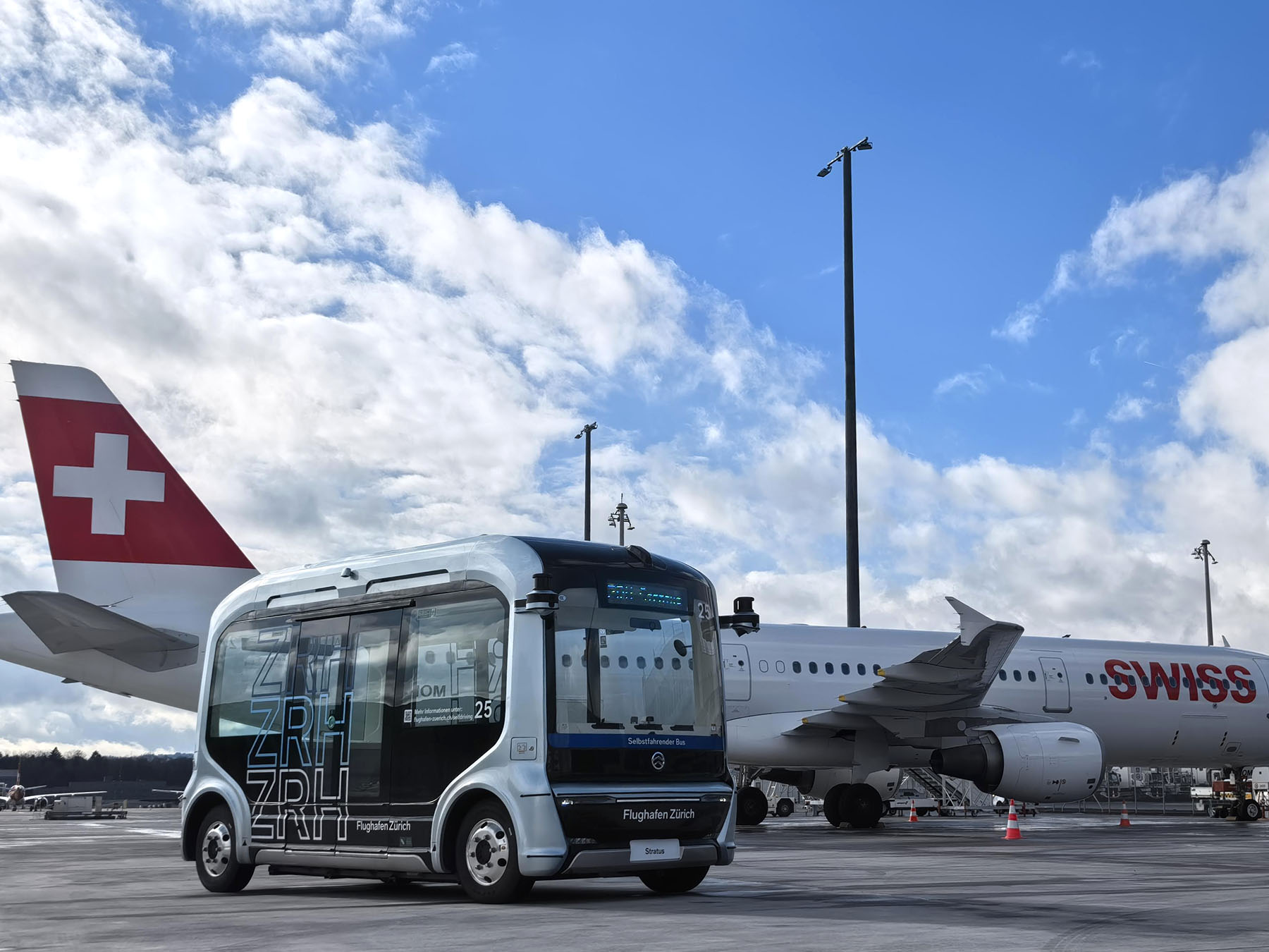A WeRide Robobus (front) operates at an airport in Zurich, Switzerland, on April 17, 2025. (PHOTO / XINHUA)