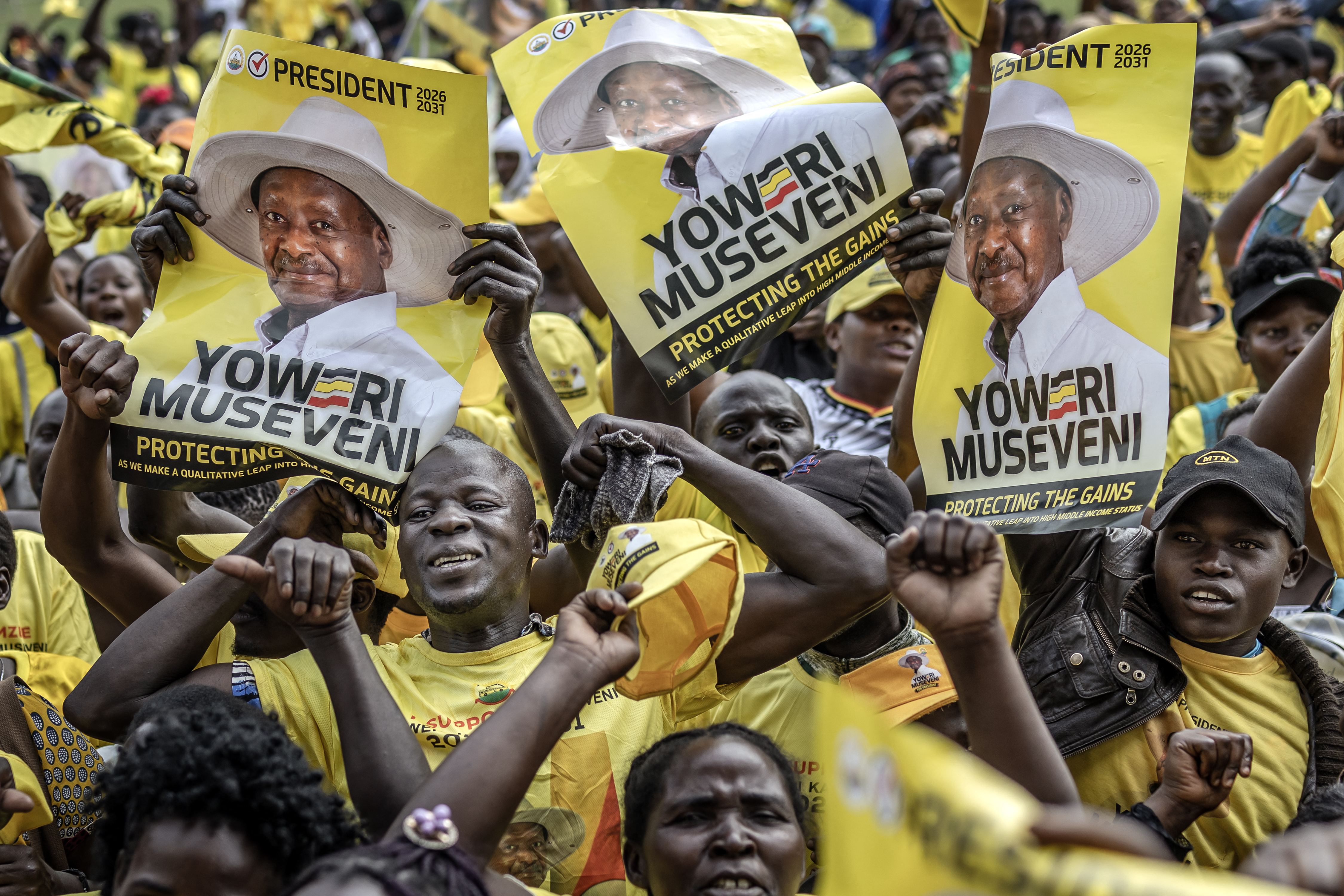 Supporters of Uganda’s incumbent president and National Resistance Movement (NRM) presidential candidate Yoweri Museveni hold electoral posters and dance in celebration during a party gathering for the announcement of final results for the 2026 Ugandan presidential election at Lugogo Grounds in Kampala on Jan 17, 2026. (PHOTO/AFP)