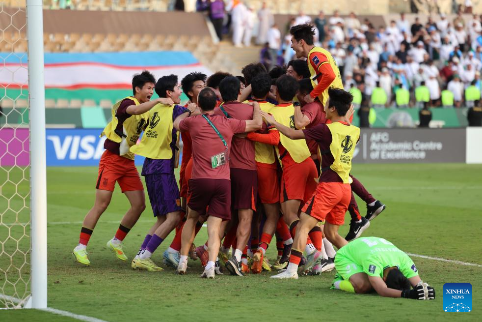 Team China celebrate winning the 2026 AFC U23 Asian Cup quarterfinal match between China and Uzbekistan in Jeddah, Saudi Arabia, Jan 17, 2026. (PHOTO / XINHUA)