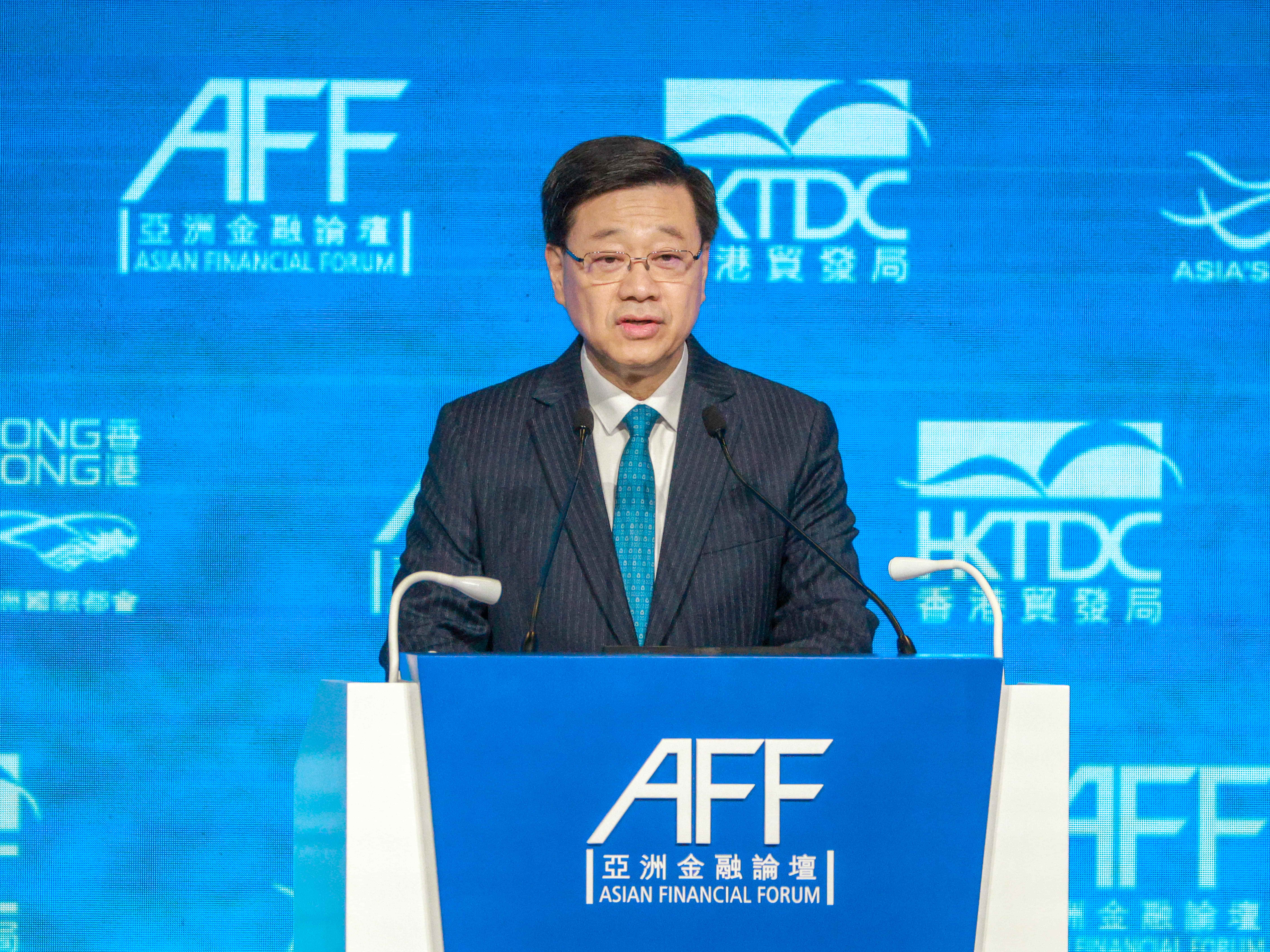 Chief Executive John Lee Ka-chiu delivers his opening remarks at the opening of the Asian Financial Forum 2026, at the Hong Kong Convention and Exhibition Centre, on Jan 26, 2026. (ANDY CHONG / CHINA DAILY)