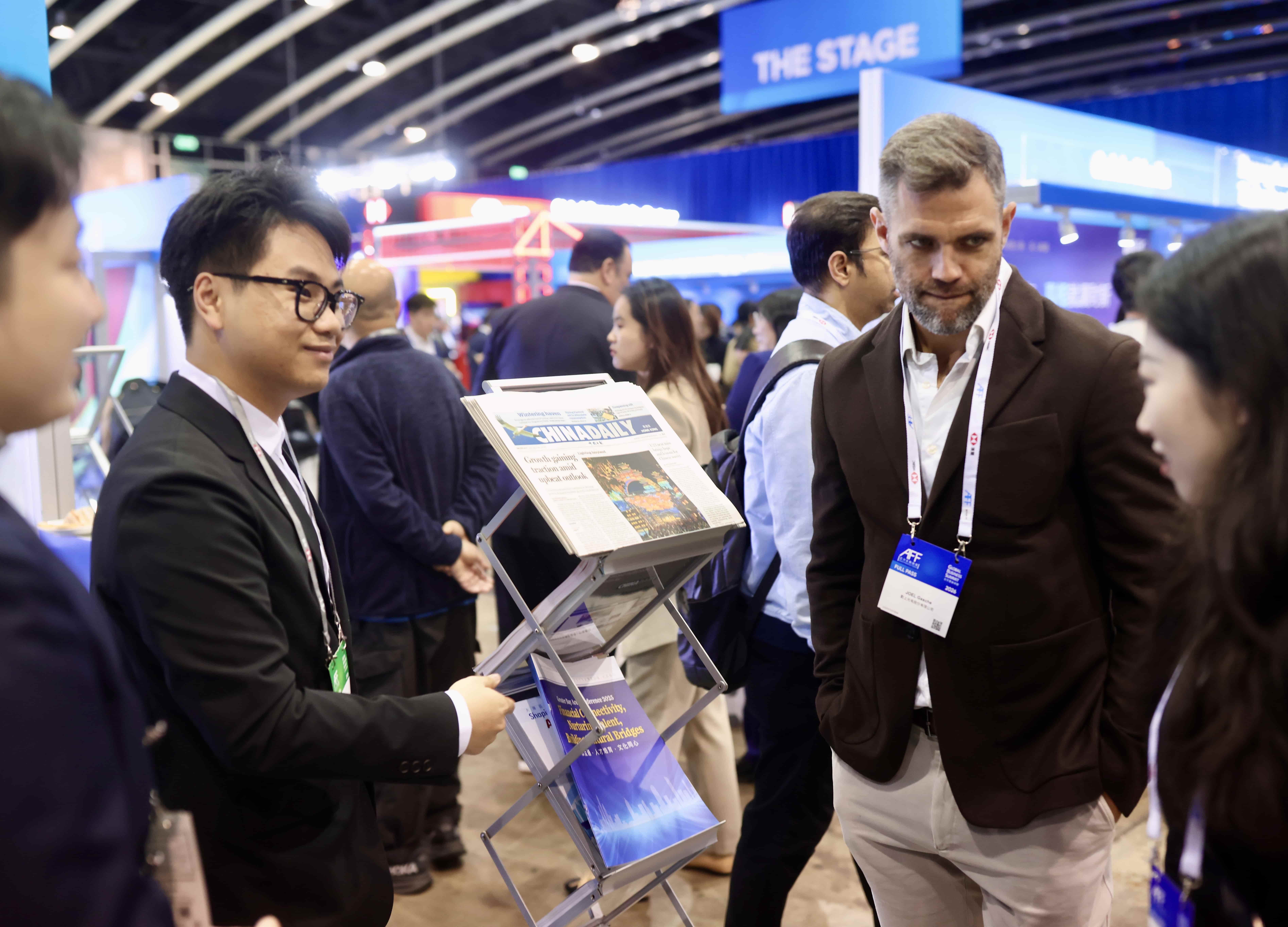 A guest discusses at the booth of the news outlet China Daily at the Asian Financial Forum 2026 on Jan 26, 2026. (EDMOND TANG / CHINA DAILY)