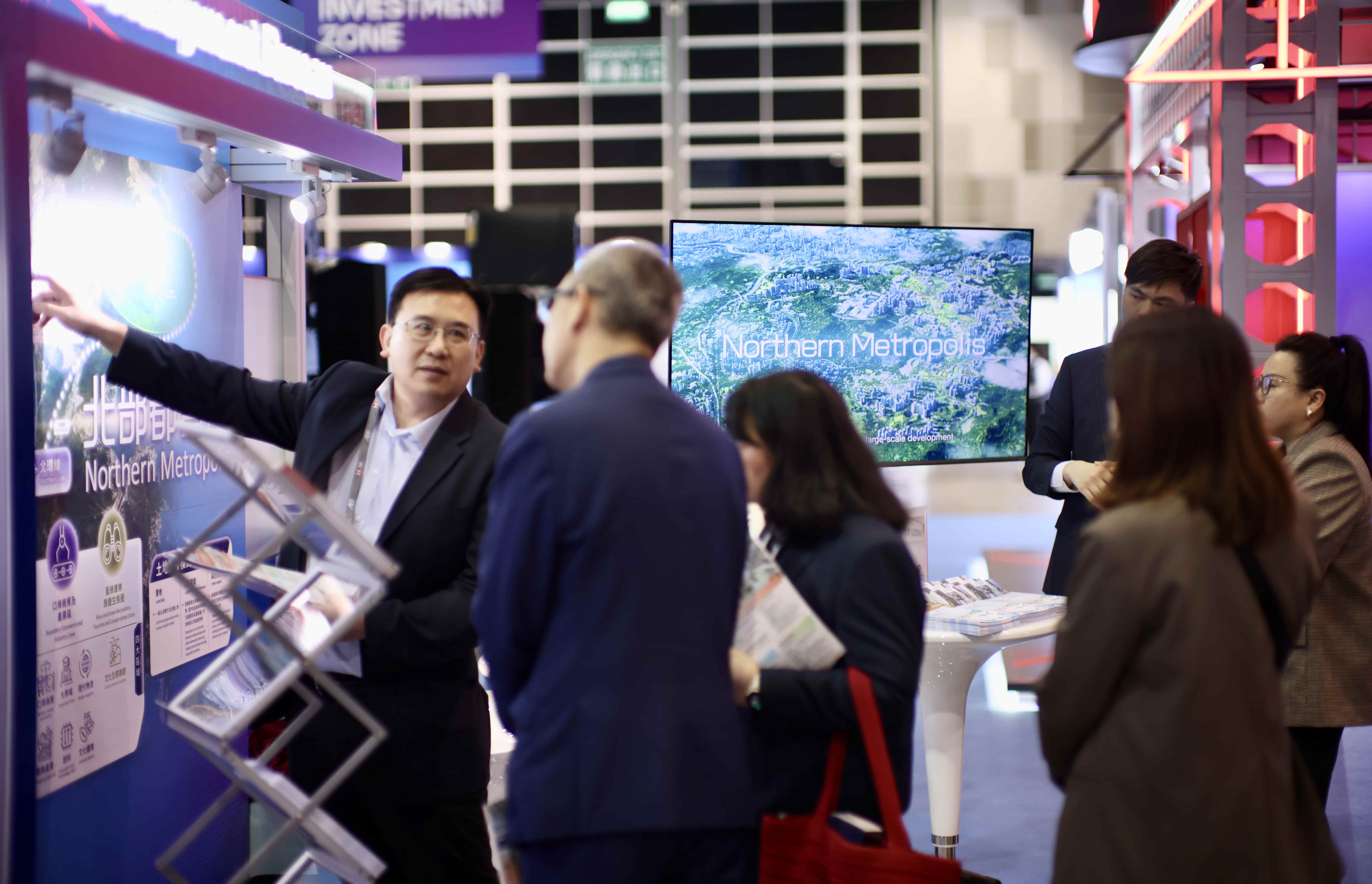 Attendees and guests discuss at the booth of Northern Metropolis project at Asian Financial Forum 2026 in Hong Kong on Jan 26, 2026. (EDMOND TANG / CHINA DAILY)