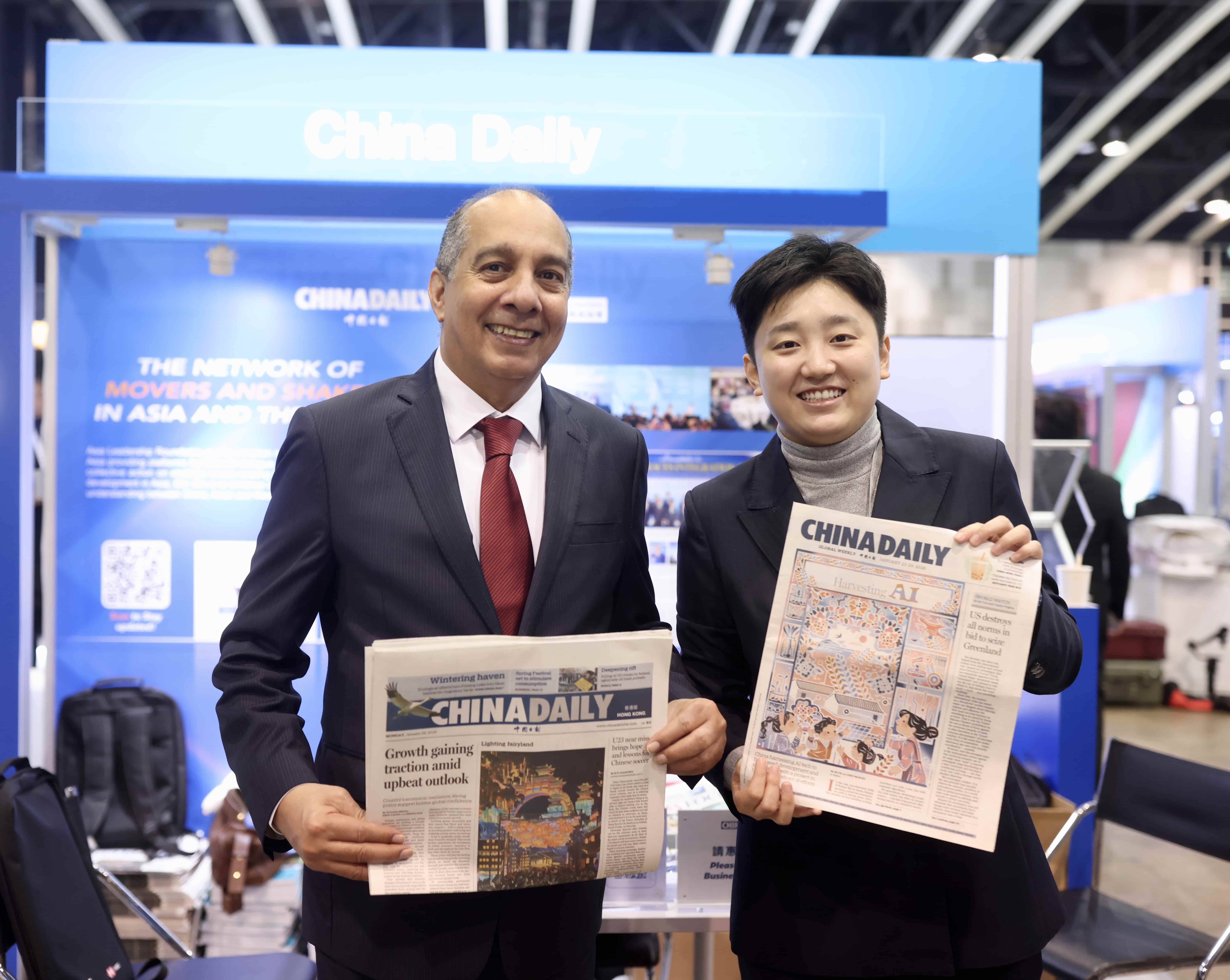 A guest and a staff member pose for a photo at the booth of the news outlet China Daily at the Asian Financial Forum 2026 on Jan 26, 2026. (EDMOND TANG / CHINA DAILY)