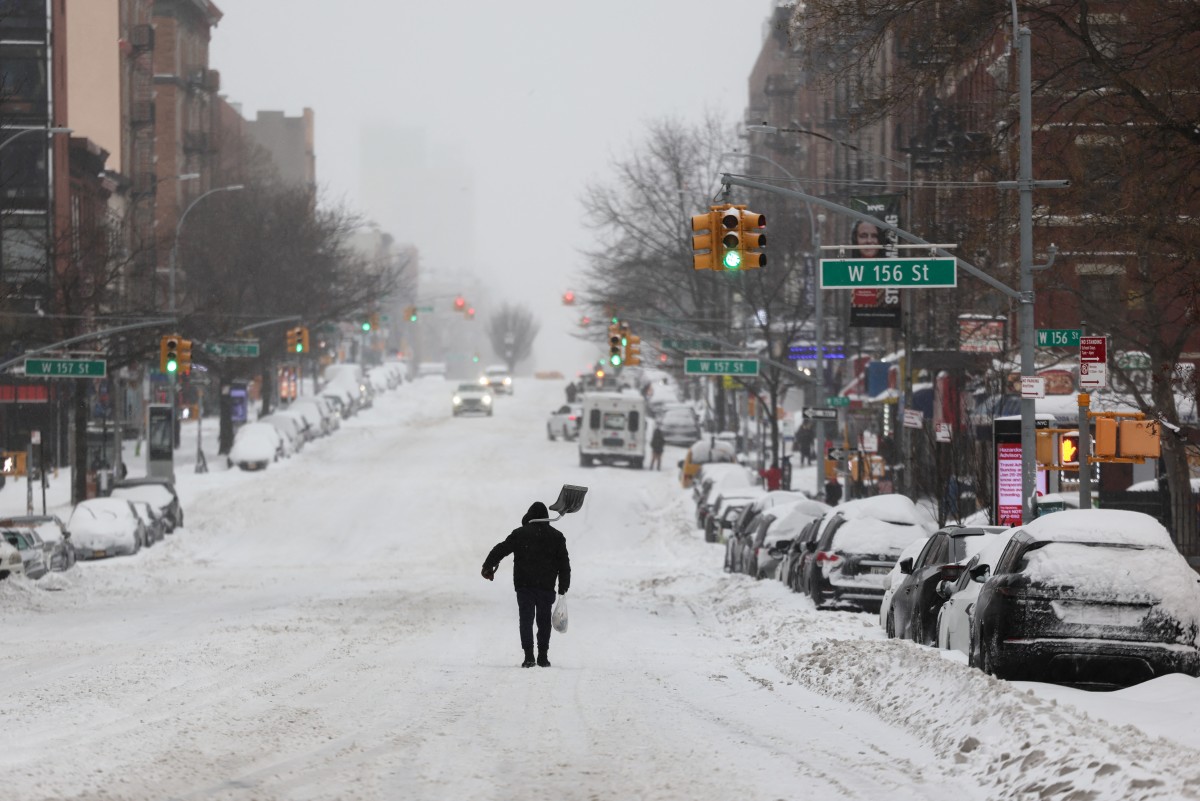 A man carries a shovel as he crosses a street in the Hamilton Heights neighborhood in New York on Jan 25, 2026. (PHOTO / AFP)
