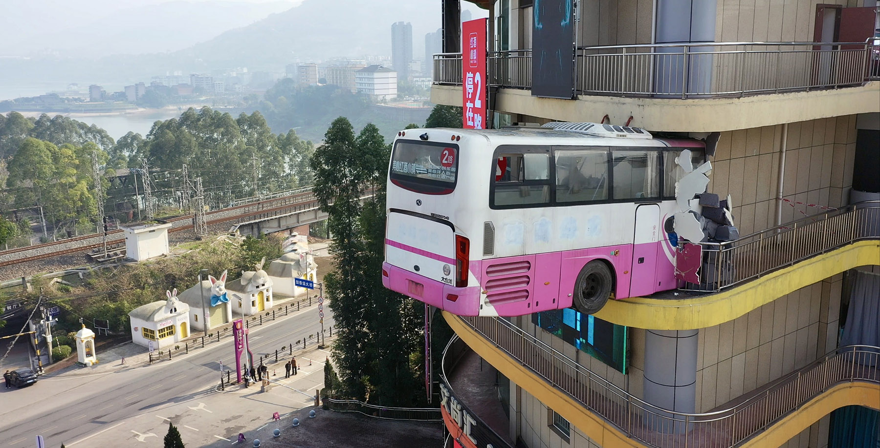 Hovering 30 meters above the ground, a No 2 bus appears to have crashed directly into the eighth floor of a building in Meixin Wine Town, Fuling district, located 50 kilometers from downtown Chongqing.