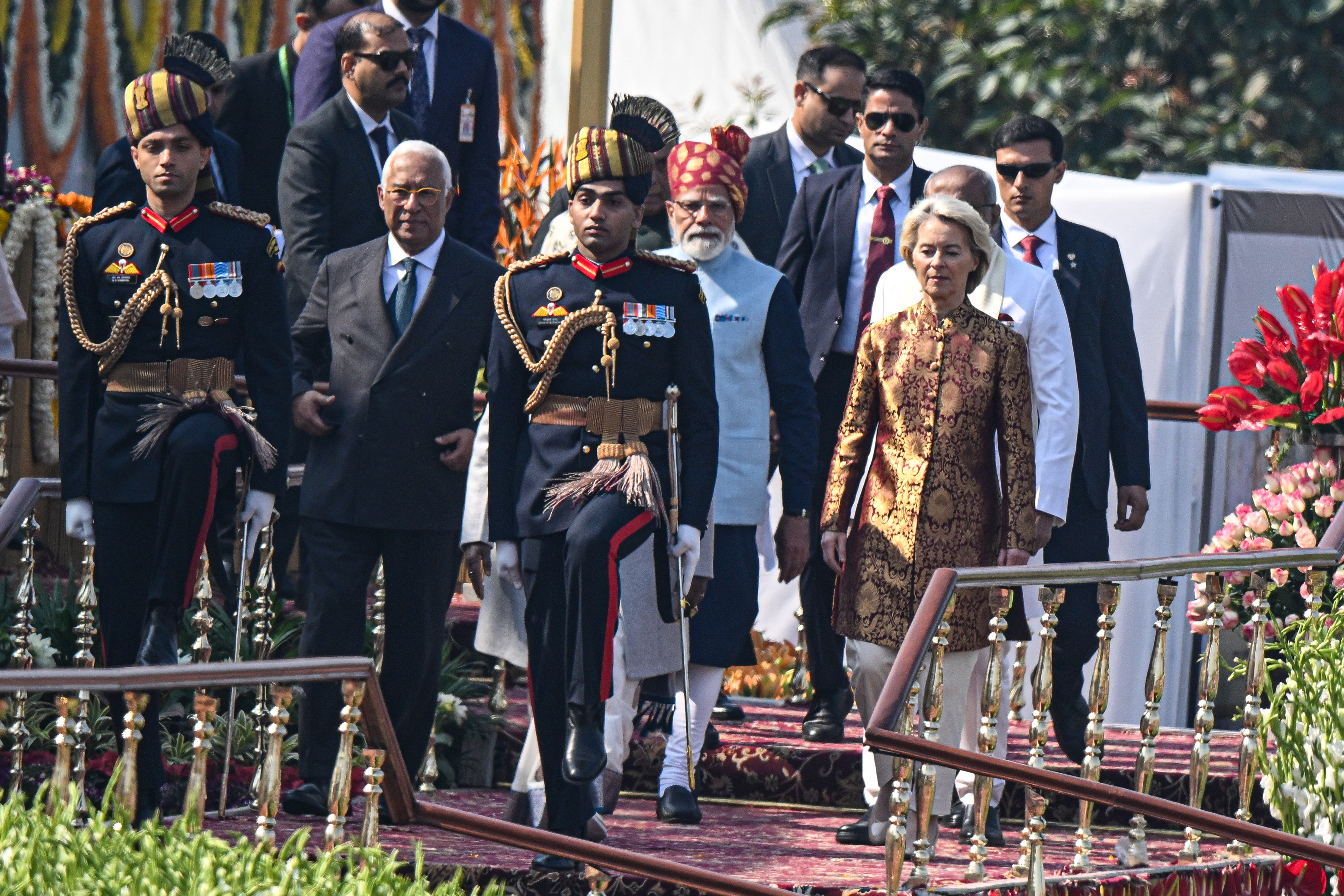 European Council President Antonio Costa (second left), India PM Narendra Modi (center), and European Commisssion President Ursula von der Leyen (right) depart following the Republic Day parade at the ceremonial Kartavya Path in New Delhi, India, on Jan 26. 2027. (PHOTO/BLOOMBERG)