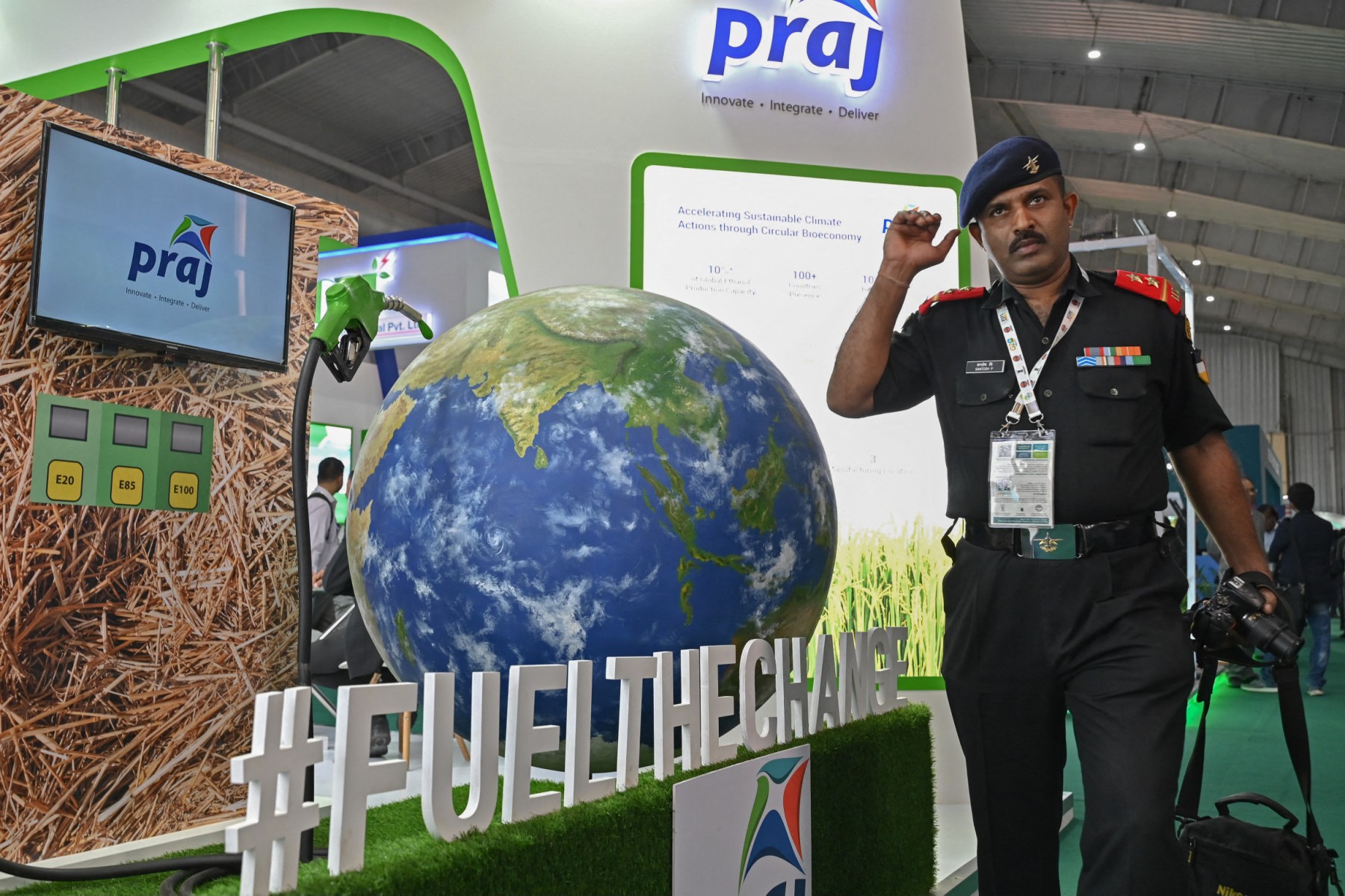 A visitor walks past a stall during an exhibition held as part of the ongoing 'India Energy Week 2023' under India’s G20 Presidency, in Bengaluru on Feb 7, 2023. (PHOTO / AFP)