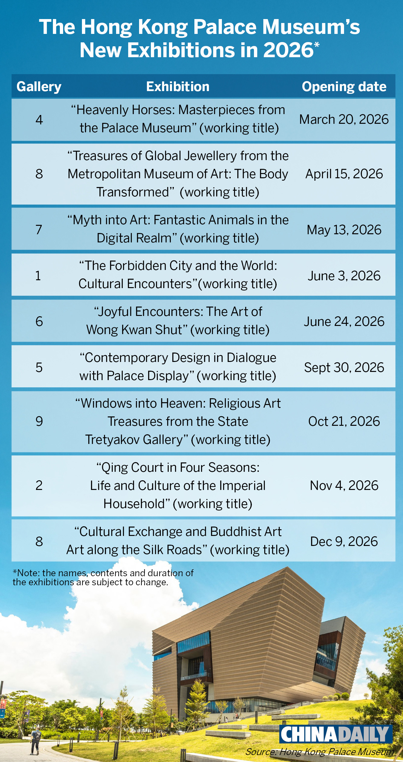 The exhibitions include The Forbidden City and the World: Cultural Encounters, opening June 3 in Gallery 1; Contemporary Design in Dialogue with Palace Display, opening Sept 30 in Gallery 5; Qing Court in Four Seasons: Life and Culture of the Imperial Household, opening Nov 4 in Gallery 2; and Heavenly Horses: Masterpieces from the Palace Museum, running from March 20 to March 17, 2027, in Gallery 4.