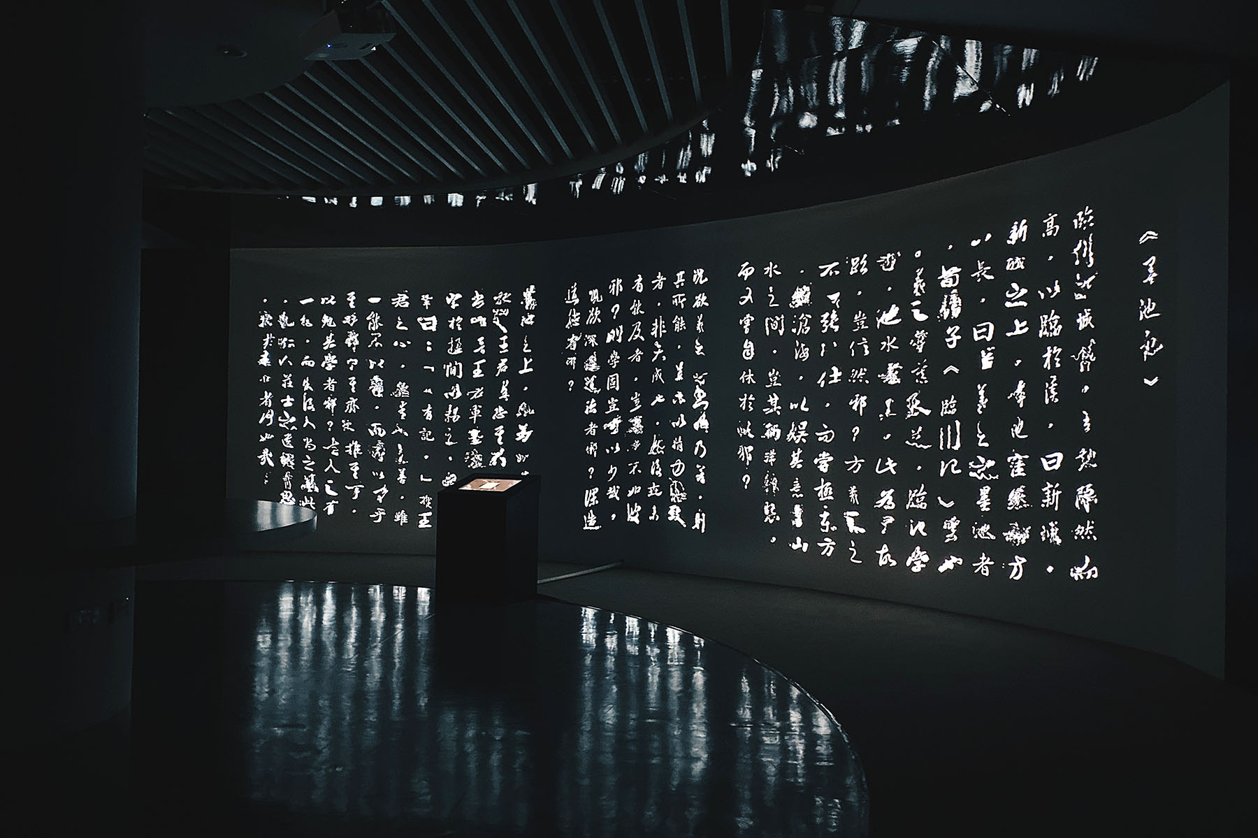 No Longer Write – Mochiji offers an immersive experience. Chinese characters written by exhibition visitors on a touch screen are added to an ever-growing mass of calligraphy displayed on a giant screen, eventually resembling a dark pond, appearing to ripple across a number of screens.