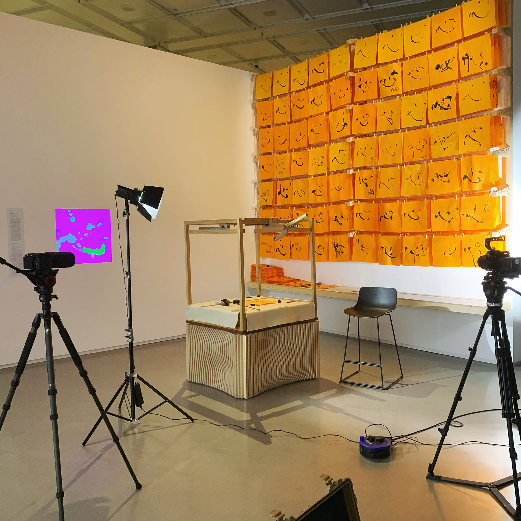 Cheung’s 2017 work, No Longer Write – Mochiji, is an interactive installation in which artificial intelligence and machine learning are used to generate Chinese calligraphy. The piece is inspired by an apocryphal story about Jin Dynasty (265-420) calligrapher Wang Xizhi (303-361), who dipped his brush into a pond so frequently that its water turned completely black.