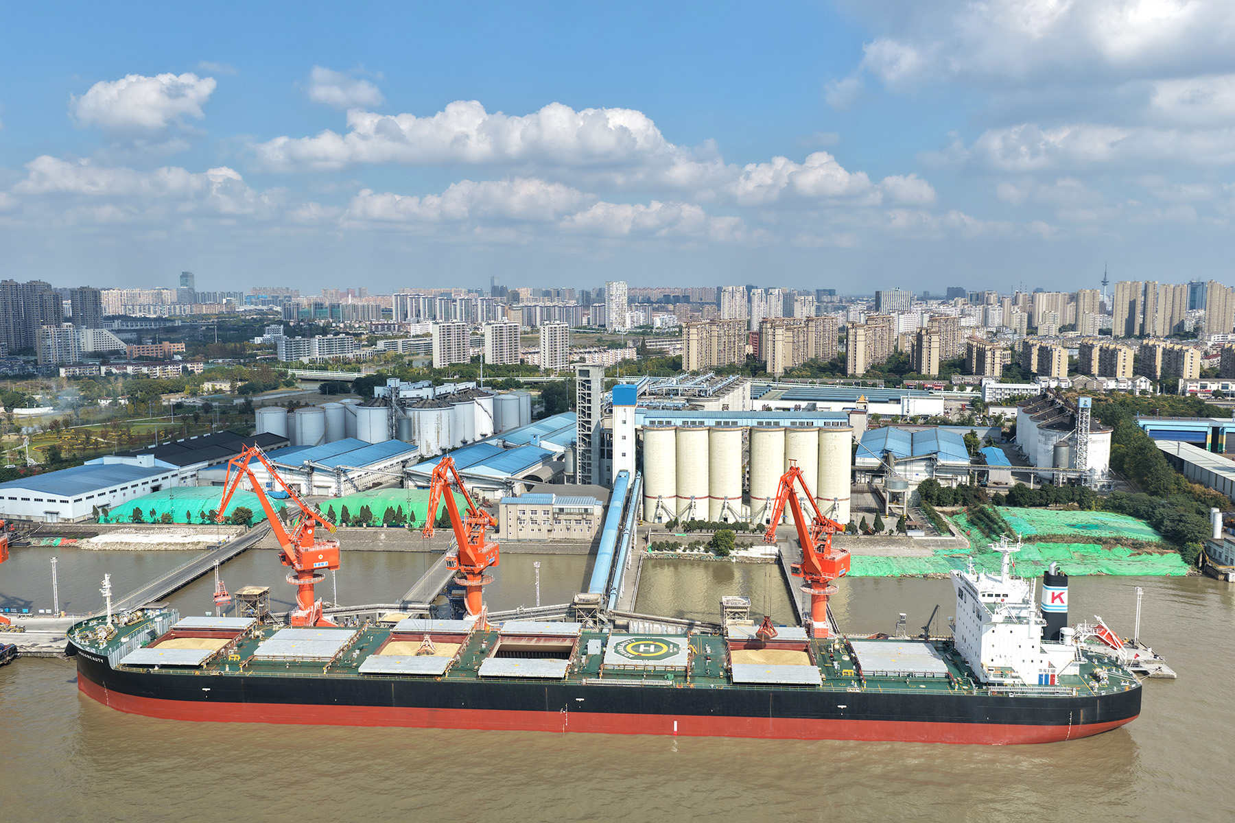 A ship unloads 38,500 metric tons of barley imported from Canada at a grain and oil transfer terminal in Nantong, Jiangsu province. (XU CONGJUN / FOR CHINA DAILY)