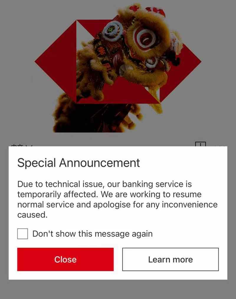 “Due to technical issue, our banking service is temporarily affected,” a message on the bank’s app said in the afternoon, adding the bank is “working to resume normal service”.