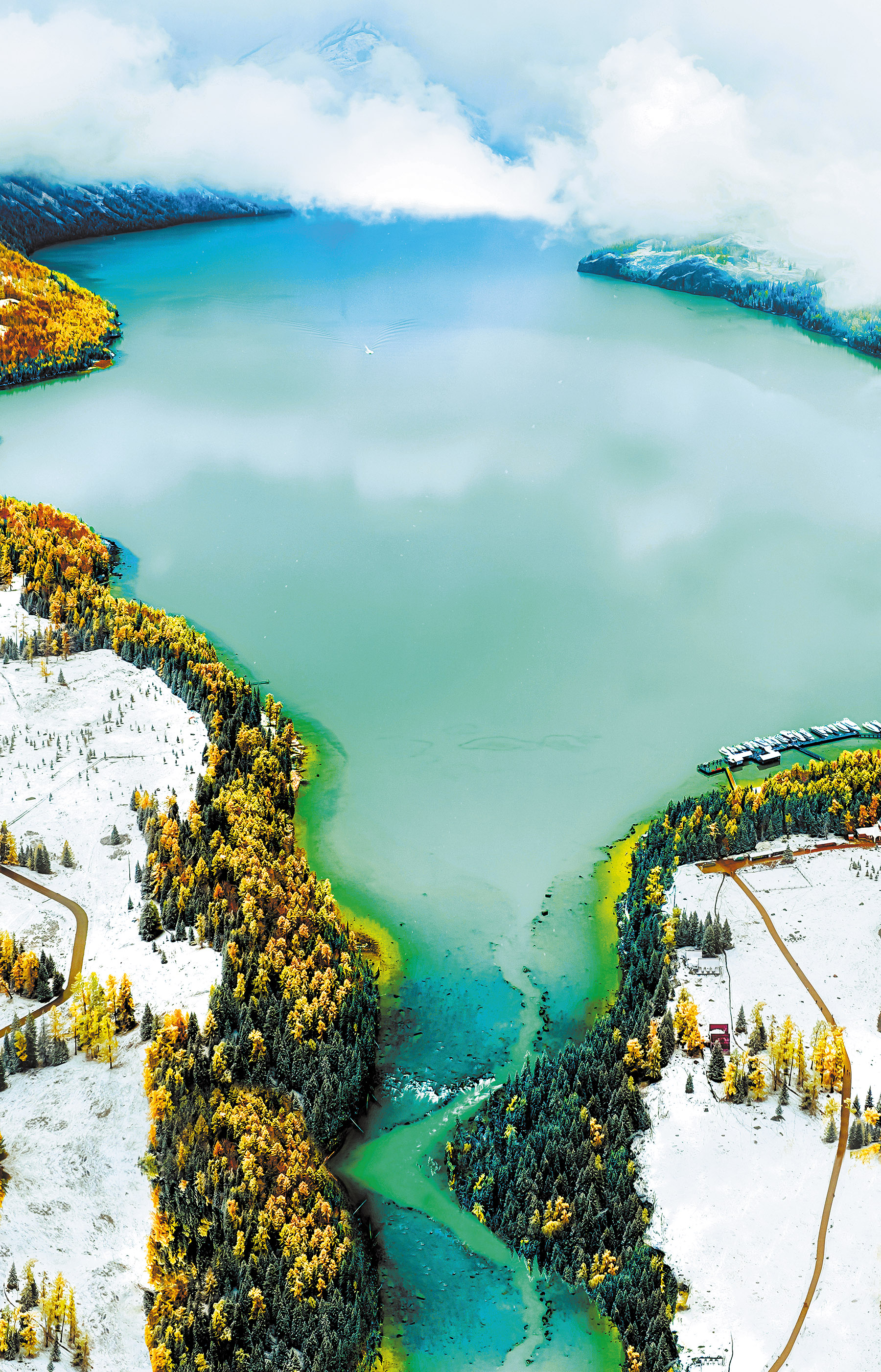 The emerald green with a milky hue adds a lively touch to Kanas Lake, whose landscape is covered in snow for most of the winter. This hidden gem in the northernmost corner of the Xinjiang Uygur autonomous region attracts visitors with its mythical charm. (PROVIDED TO CHINA DAILY)