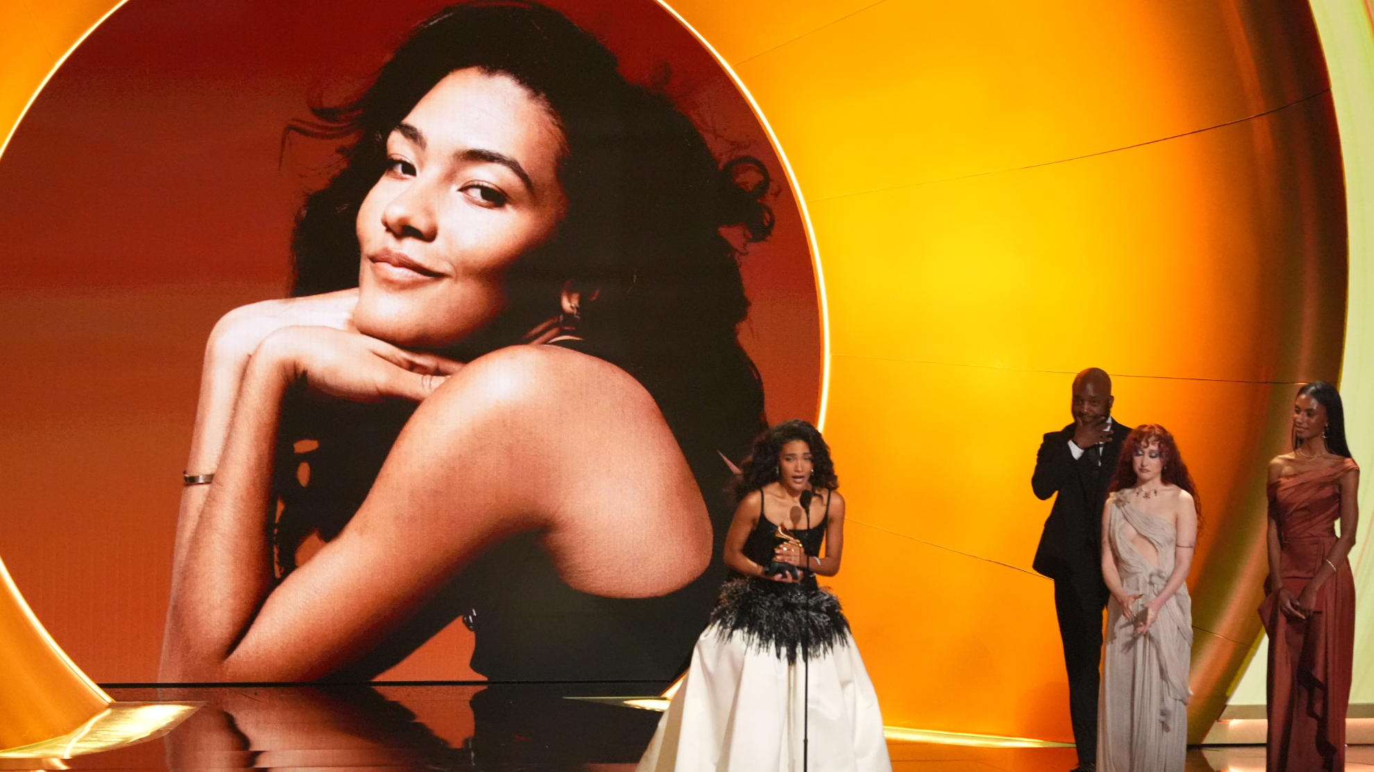 Accepting her award as best new artist, British soul-pop singer Olivia Dean paid tribute to a grandmother who immigrated to Britain from Guyana as a teenager seeking a new life.