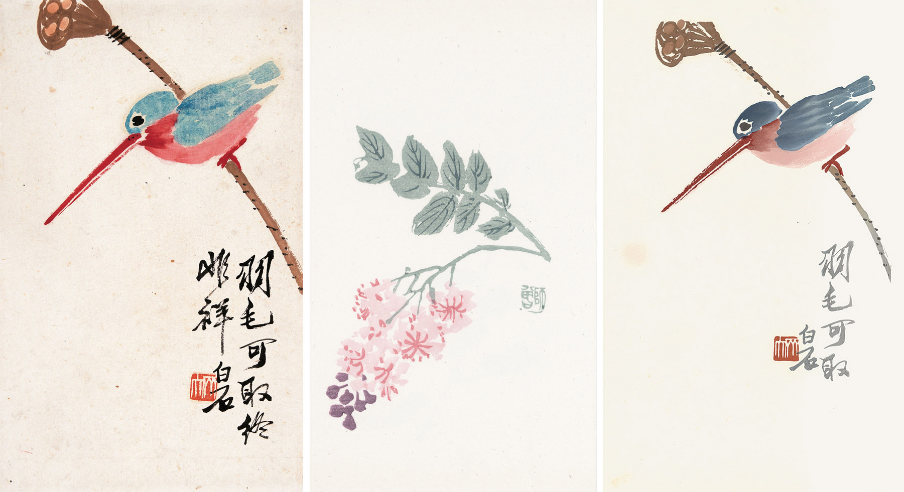 The exhibition shows huajian patterns created by noted artists such as Qi Baishi (left and right) and Chen Shizeng (middle). (PROVIDED TO CHINA DAILY)