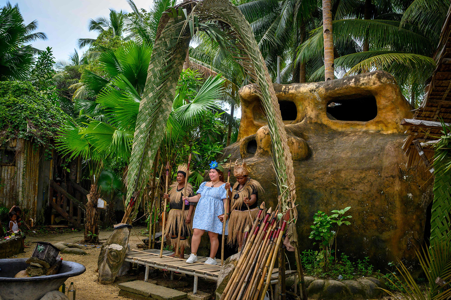 A tourist is entertained by the members of the Ati tribe in their village on Bohol Island on Dec 8, 2025. (PHOTO / AFP)