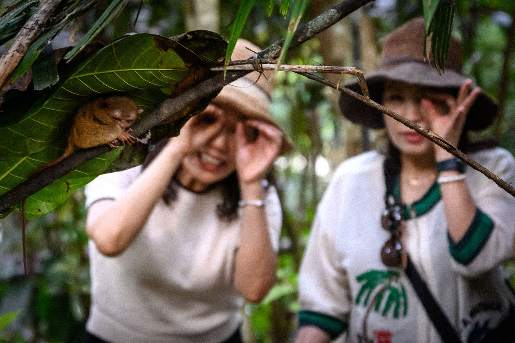 Tourists pose for photo with a Tarsier on Bohol Island in the Philippines on Dec 8, 2025. (PHOTO / AFP)