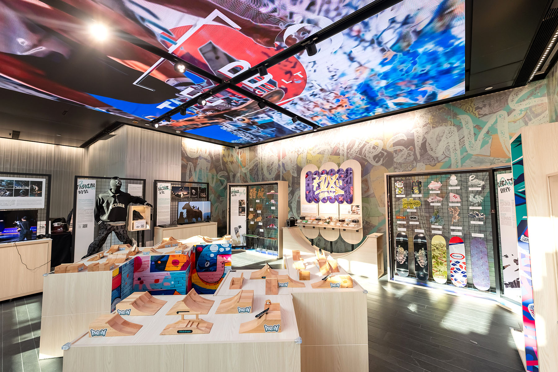 The compactly designed Drop In exhibition offers a layman’s guide to the rich and colorful world of skateboarding. Curator Henry Siu’s vision for the show goes beyond a display of skateboarding gear. Rather, the founder of Psyroot — a Hong Kong-based lifestyle brand rooted in street culture — chose to focus on the culture surrounding the sport. For instance, the artwork, particularly graffiti, on the skateboards featured in Drop In point to the existence of a unique vocabulary shared between skateboarders. While the artwork on a skateboard reflects the user’s individual style, often the design has elements that signify allegiance to a particular club or community of skateboarders.