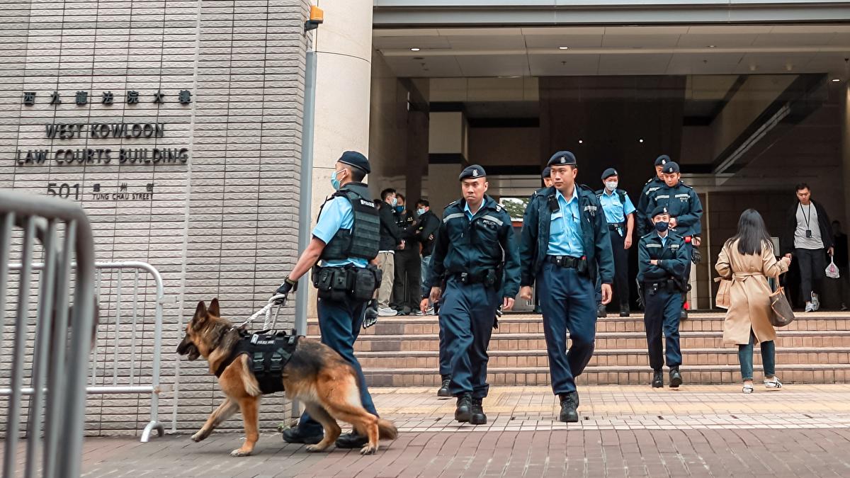 In this file photo dated Dec 18, 2024, police officers patrol outside the West Kowloon Magistrates’ Courts on the first day of Jimmy Lai Chee-ying’s trial. (ANDY CHONG / CHINA DAILY)