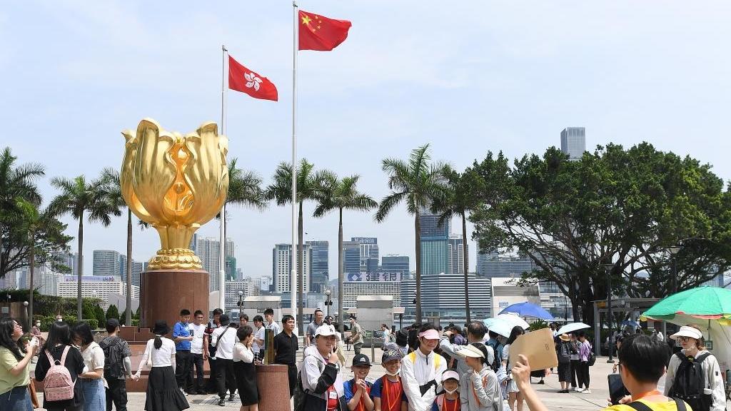 Tourists visit the Golden Bauhinia Square in south China's Hong Kong on April 30, 2023. (PHOTO / XINHUA)