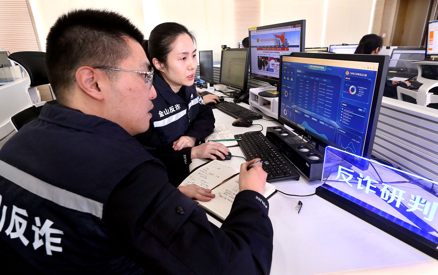 Anti-fraud police officers check the backstage data and warnings given by a smart application in Shanghai on March 25, 2025. (PHOTO / XINHUA)