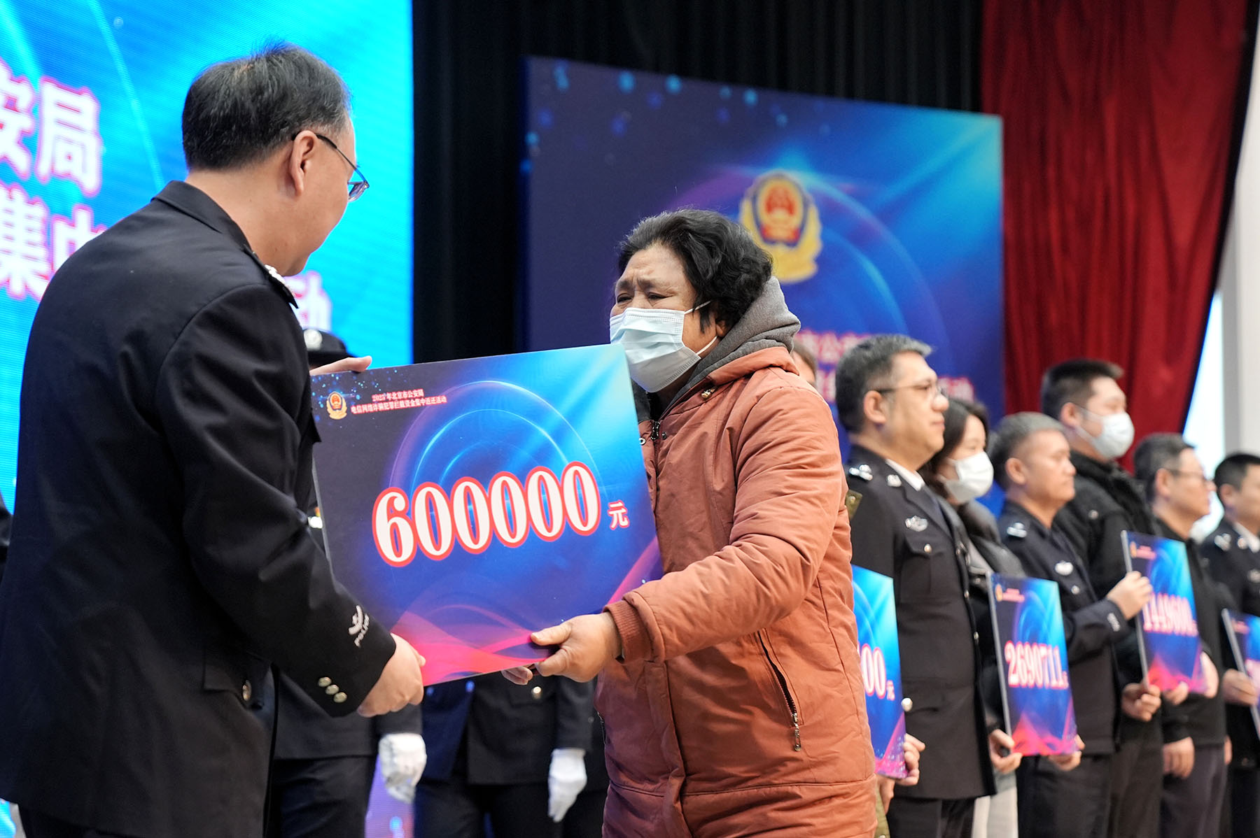A telecom victim receives 600,000 yuan ($86,580) of recovered money during a ceremony in Beijing on Dec 9, 2025. Some 30 victims received a total of around 30 million yuan. (PHOTO / CHINA NEWS SERVICE)