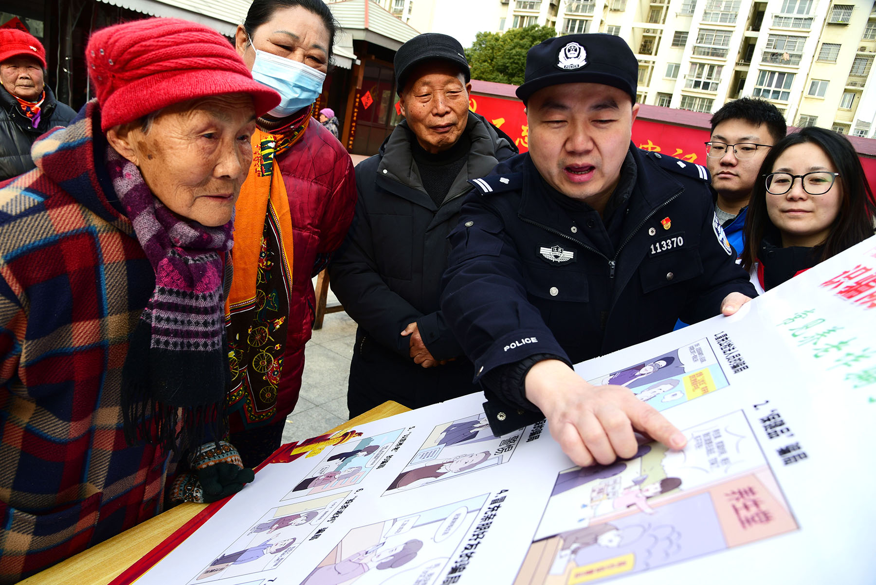 A police officer explains a case from anti-fraud pamphlets in Zhenjiang, Jiangsu province, on Feb 20, 2025. (SHI YUCHENG / FOR CHINA DAILY)