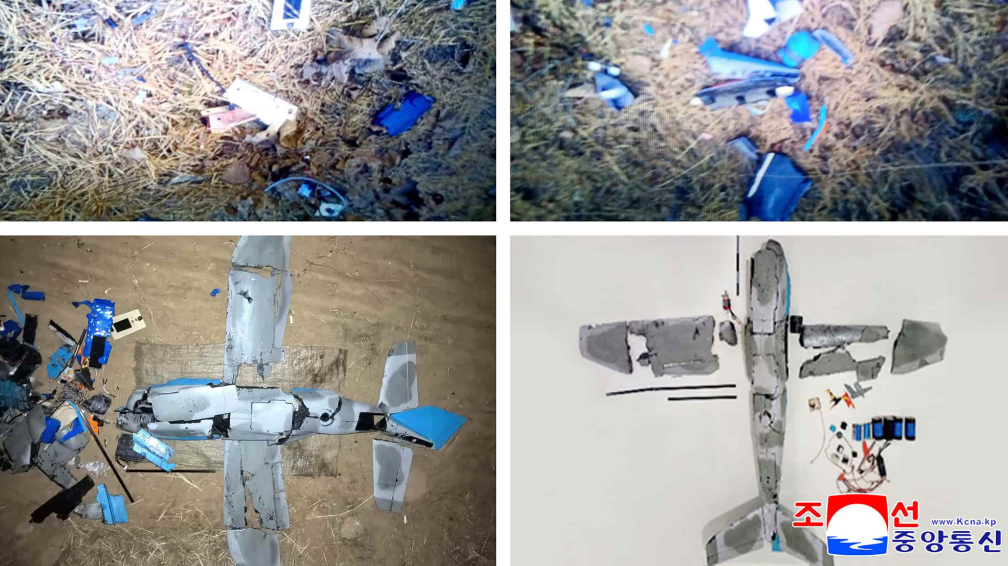 These images, taken on Jan 4, 2026, and released as a combo image by the Democratic People's Republic of Korea (DPRK)'s official Korean Central News Agency (KCNA) on Jan 10, 2026, show wreckage of a drone that DPRK claims originated from the Republic of Korea, and brought down by specialized electronic warfare assets. (PHOTO / HANDOUT VIA AFP)