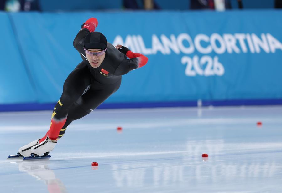 Ning Zhongyan of China competes during the speed skating men's 1,000m competition at the Milan-Cortina 2026 Olympic Winter Games in Milan, Italy, Feb 11, 2026. (PHOTO / XINHUA)