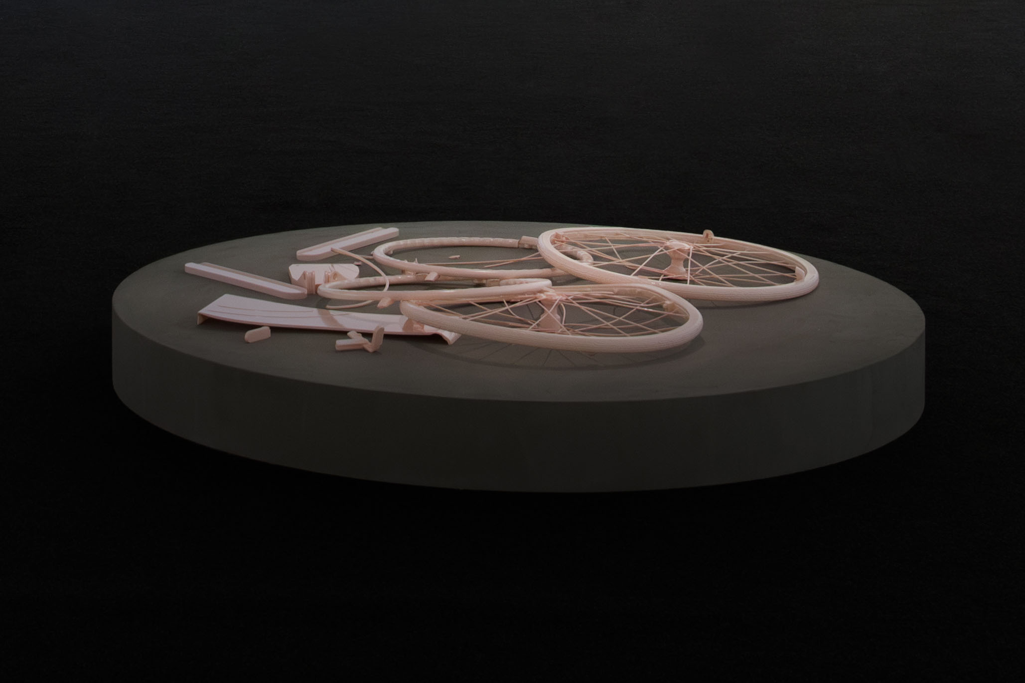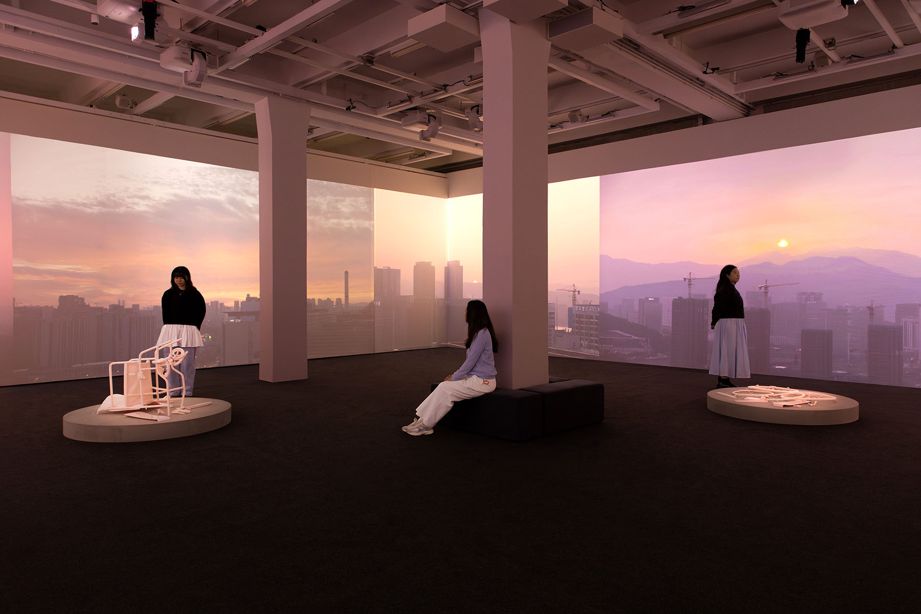 For instance, footage of wheelchairs feature prominently and might turn your mind to thoughts of decay, and even finality — a notion drummed home when in the final shot of this 12-minute experience a wheelchair falls on the ground and shatters into pieces. To underscore the point, broken remains of 3D-printed wheelchair sculptures have been placed on circular platforms on the floor. Zhang says that he wants his viewers to contemplate the transitory nature of the time and its impact on the human condition.