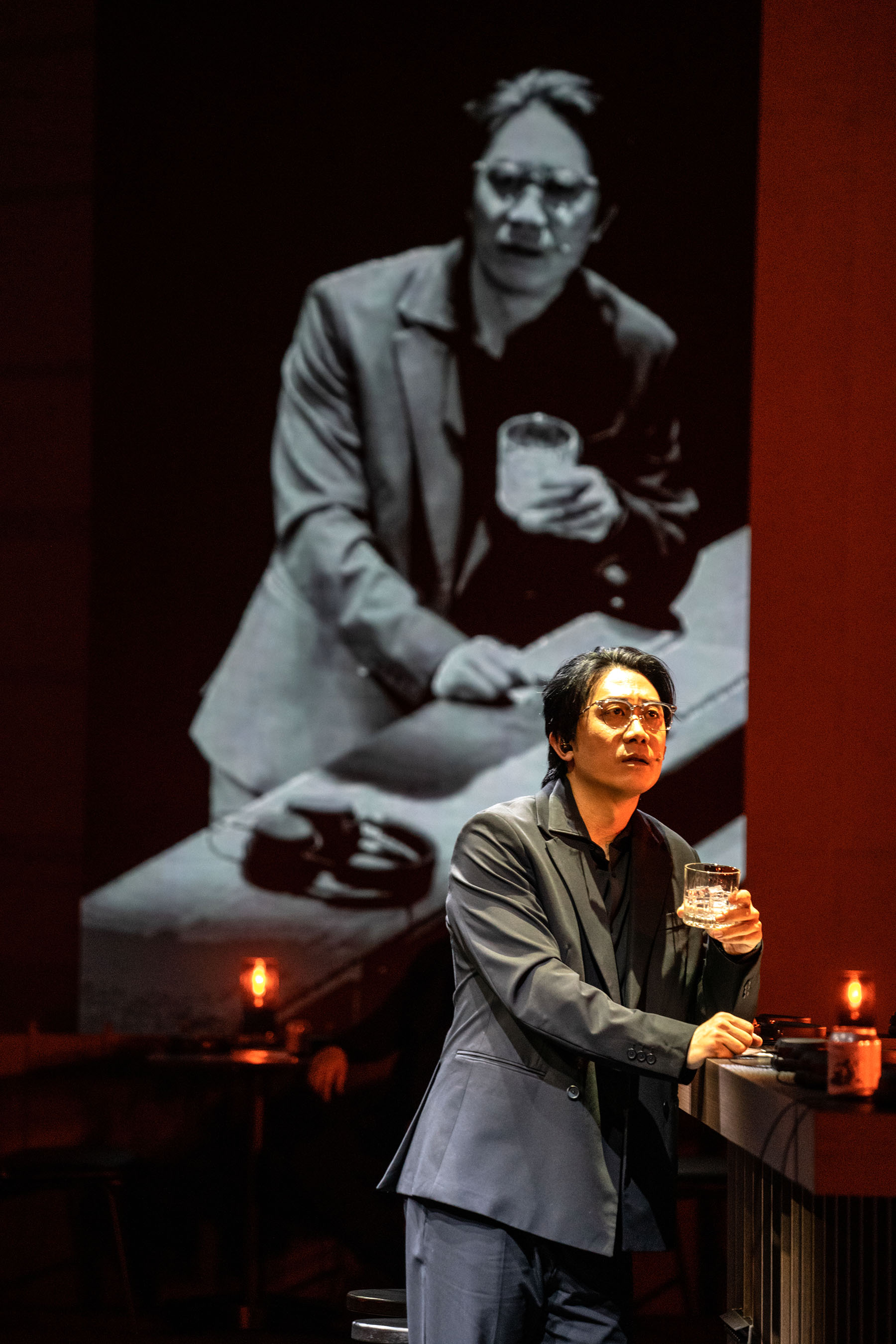 Welcomed to The Turns, guests arrange themselves self-consciously at dining tables, on steps or against a long bar counter. The commencement of “a recording session for a requiem” is announced, and a digital clock begins an 80-minute countdown. The smart-dressed ushers, members of the chamber choir Noema, suddenly begin singing beautiful choral harmonies — drawn from David Lang’s song cycle, The Writings (2022) — before the Big Brother begins his story. Live projections showing earnest performers and dumbstruck audience members — not yet at one with each other, despite the evident intention to destroy the conceptual fourth wall — appear in the background.