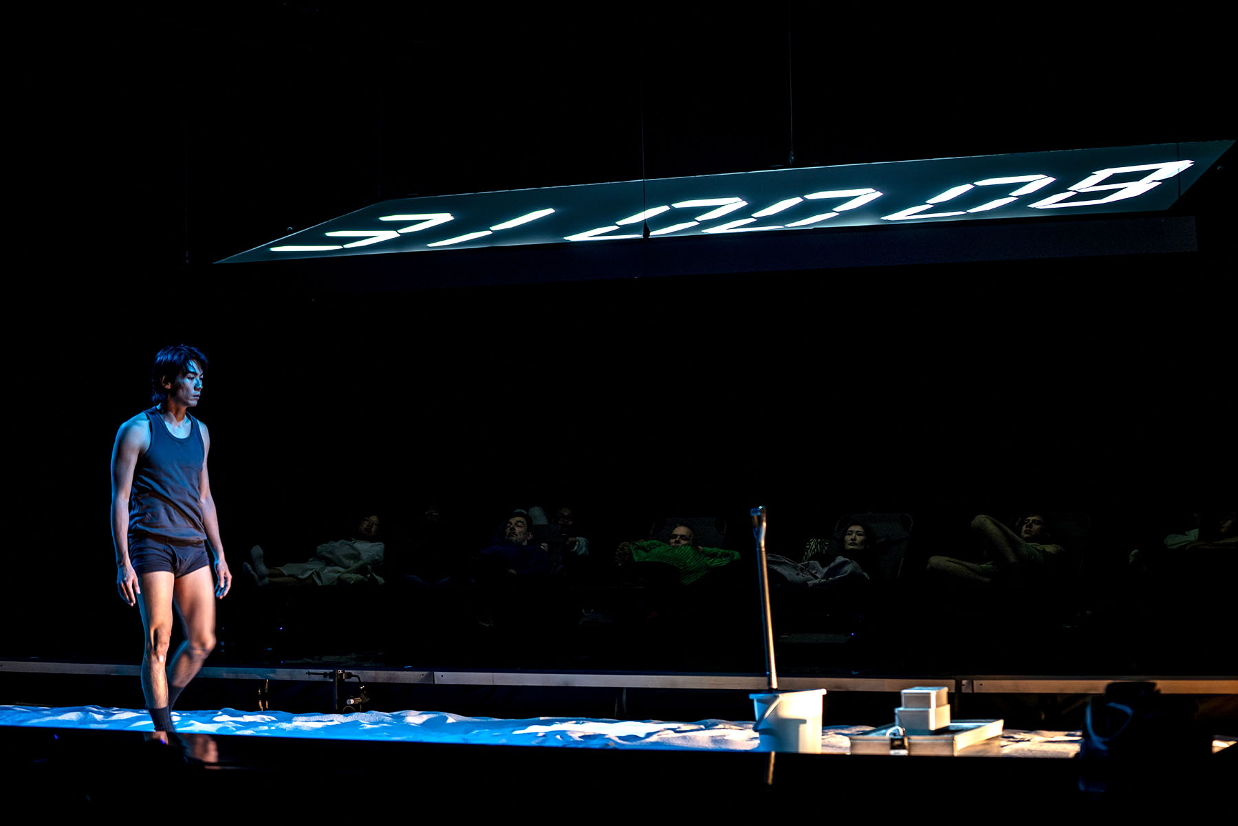 Meanwhile, the younger brother’s side of the story unfolds simultaneously in The Lab, where guests sprawl on deckchairs to embark on a 78-minute “deep sleep experimental journey”. While they doze in the dark, interrupted intermittently by garbled dialogue and industrial noises, the deceased younger brother is shown to discover fragments of his older brother’s letters in a sandbox. The contents of the letters are projected on a screen for the benefit of the audience. The chorus appears for a stirring finale, while voyeuristic images of the live audience in The Turns next door fill the screen. Is this moment about the final fraternal parting or a fleeting contact with the afterlife?