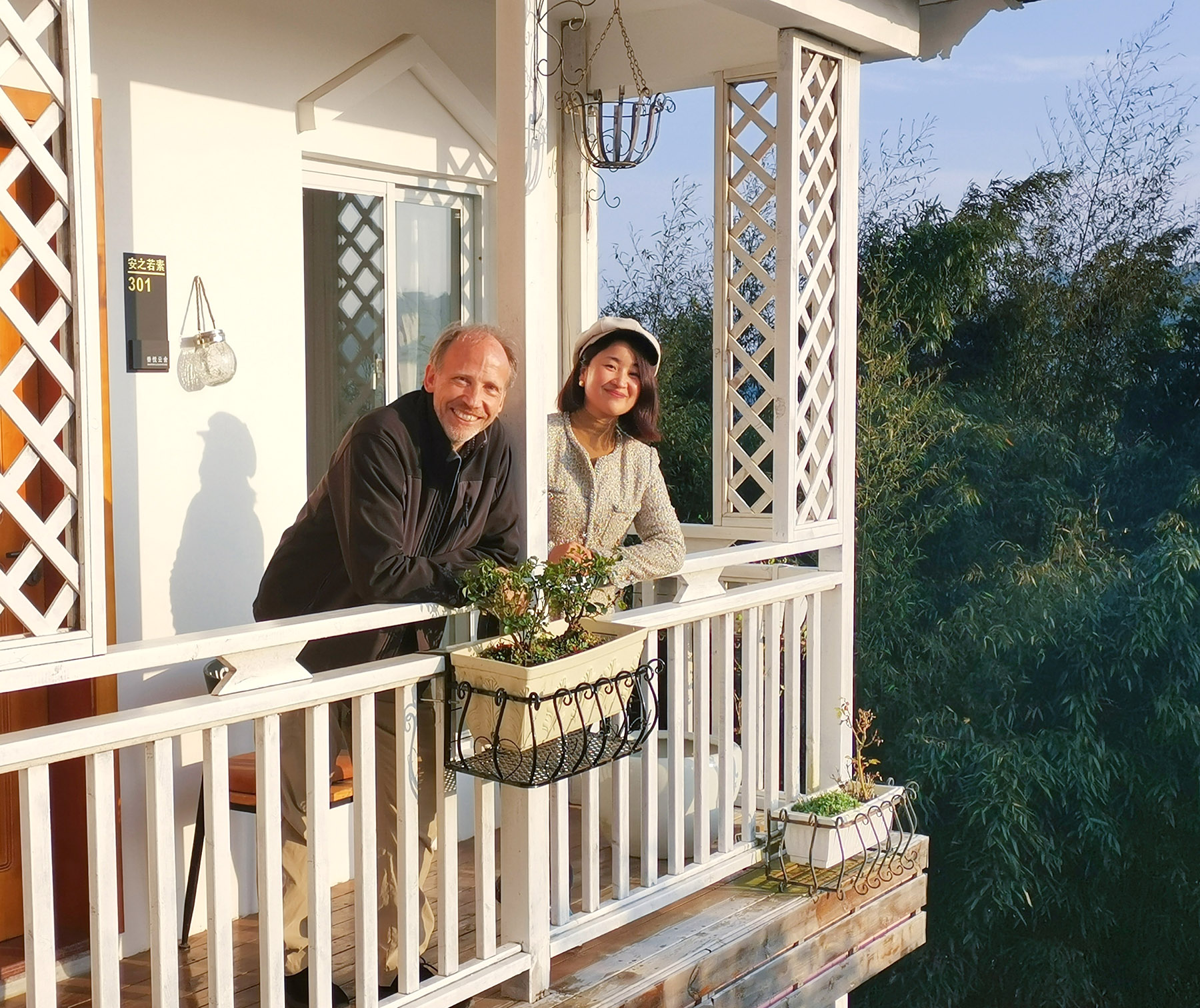 Wang Xiaojing, owner of a local homestay Sharon Cloud House, poses with her guest from the United States. (PROVIDED TO CHINA DAILY)