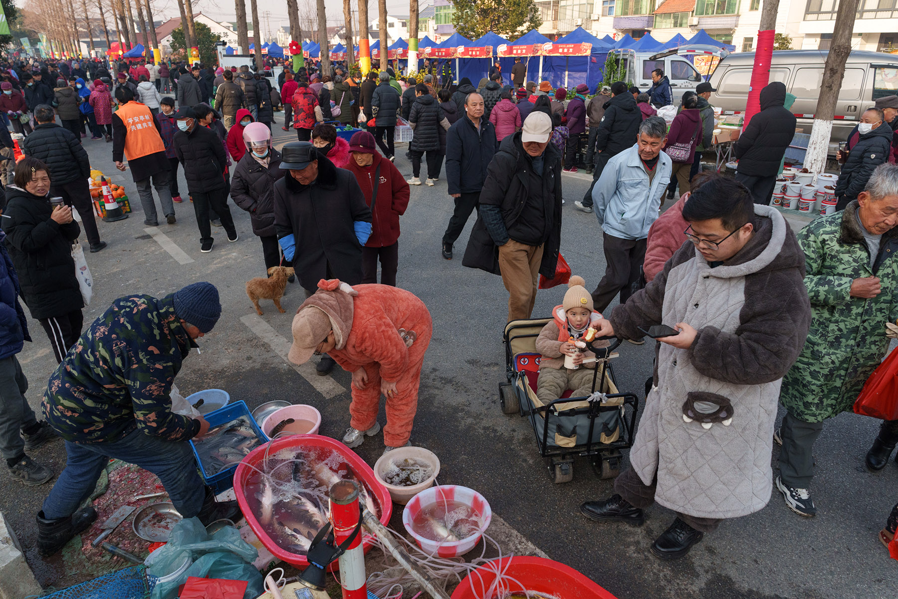 Among them is Wang Yehong, 50, who excitedly brought her husband and dog to immerse themselves in the fair's lively vibe. At the fair, they bought fresh, earthy local specialties, such as meat, vegetables, snacks, strawberries and more, for the Chinese New Year holiday.