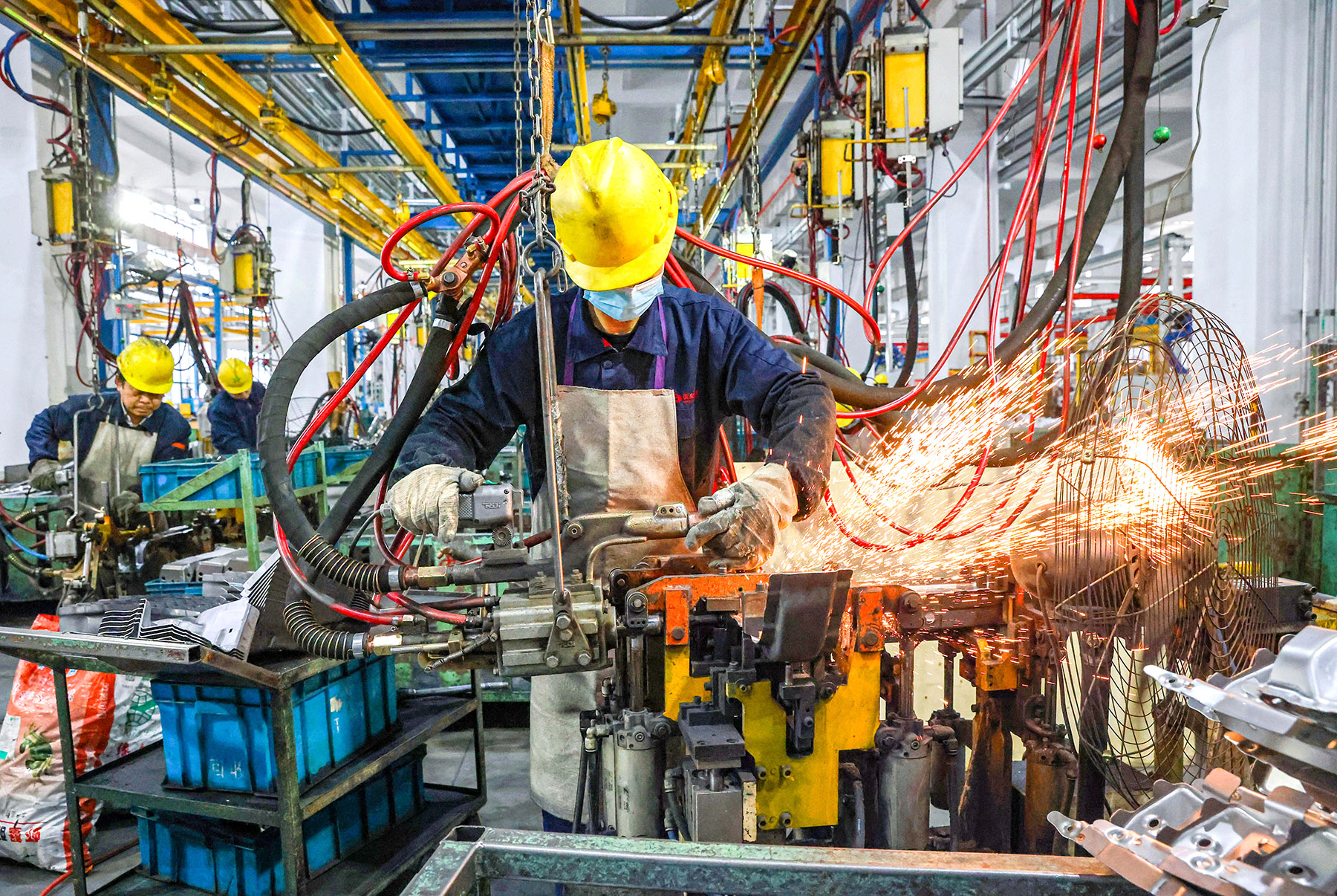 Employees work on a production line at a welding workshop of Yangzhou Hongquan Industrial Co in Yangzhou, Jiangsu province, on Feb 28, 2026. (REN FEI / FOR CHINA DAILY)
