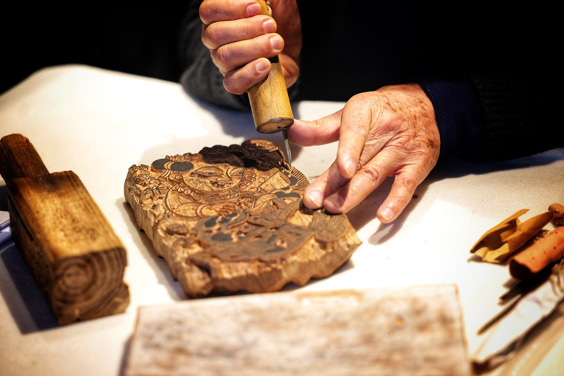 A master carver transfers a drawn design onto a smooth, seasoned plank, traditionally pear wood for its fine, durable grain. Then, using chisels and knives, they meticulously carve away the negative space, leaving the design's lines raised. This becomes the "line block".